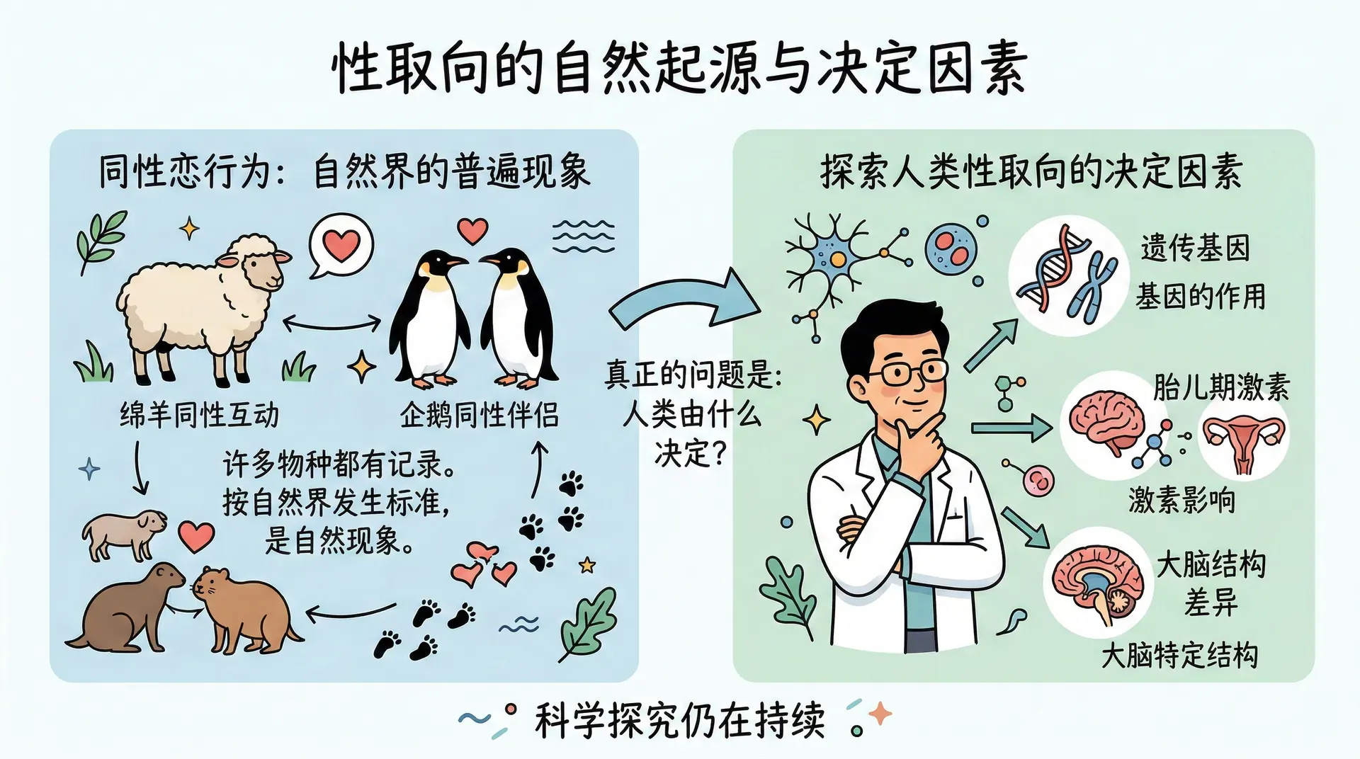 这几种解释并不相互排斥,真实情况很可能是多种机制同时作用的结果。科学研究在这里的目标是理解人类行为多样性的形成机制,而不是对性取向作出价值判断。