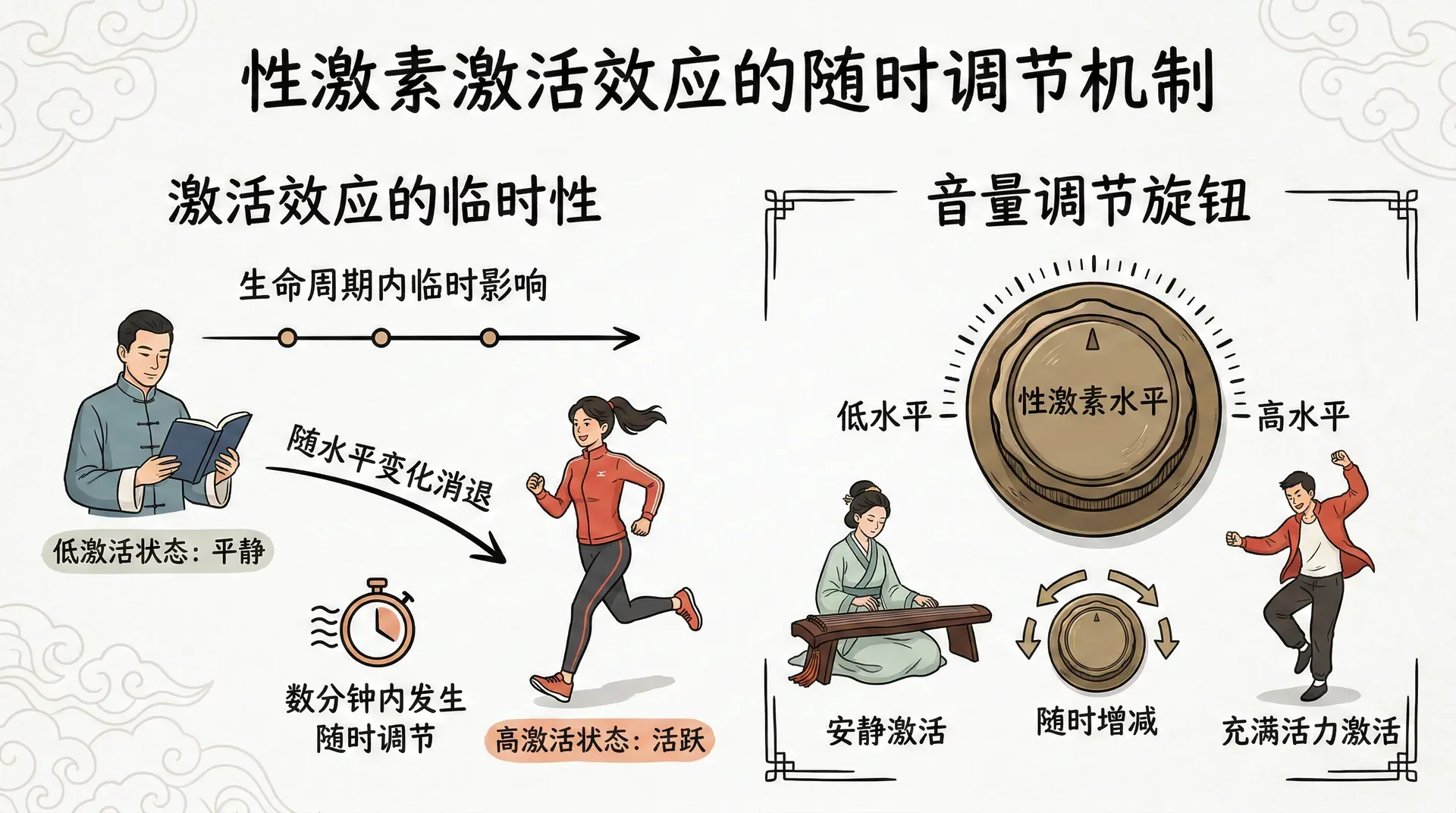 与永久性的组织化效应不同,激活效应是性激素在整个生命周期内都可以产生的临时性影响。这类效应可以在数分钟内发生,也可以随激素水平的变化而消退,就像调节音量的旋钮,随时可以增减。