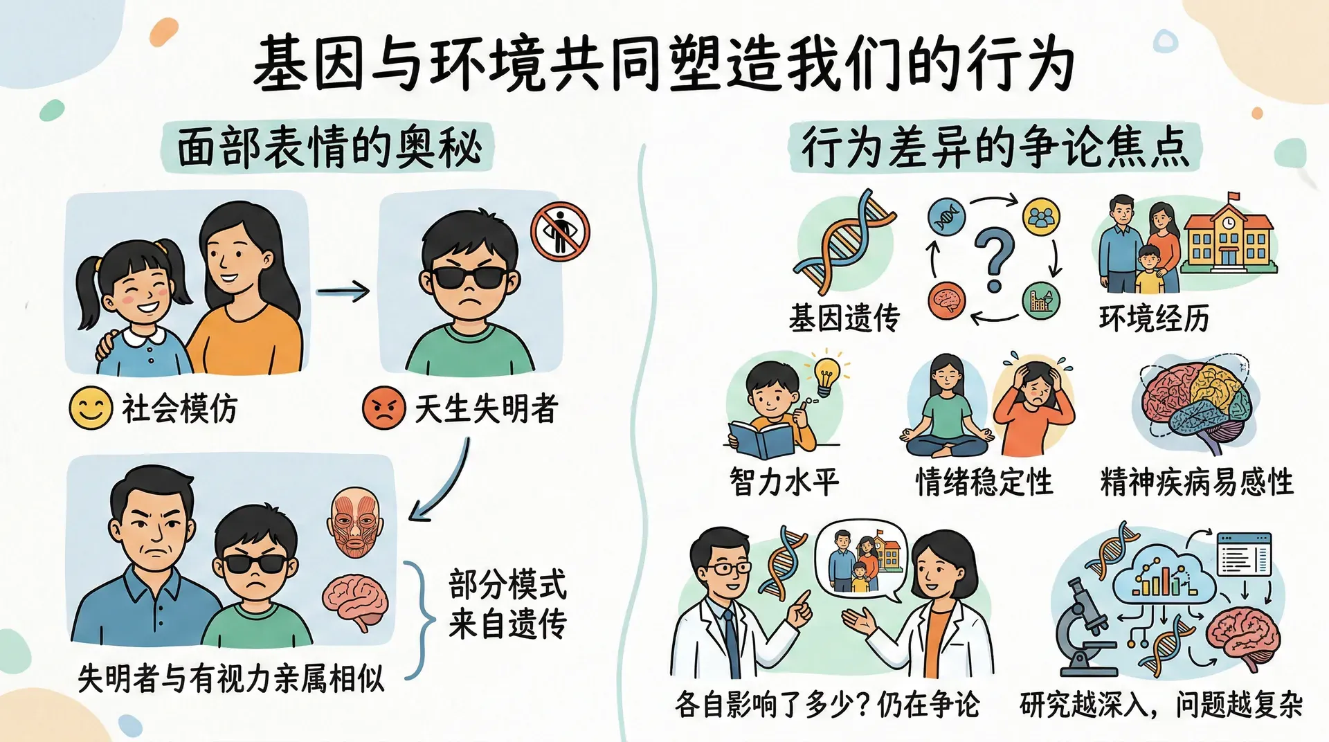 面部表情提供了一个直观的切入点。我们的表情当然受到社会环境的影响——开心时笑、难受时皱眉,这些与成长经历密切相关。但遗传的作用是否也在其中?研究者对天生失明的人进行了观察,这些人从未见过别人的表情,没有通过模仿学习的机会。结果发现,他们在高兴、悲伤、愤怒等情绪下的面部肌肉运动,与有视力的亲属高度相似。这说明某些面部表情的模式是写在基因里的,而不完全依赖于后天的观察和学习。