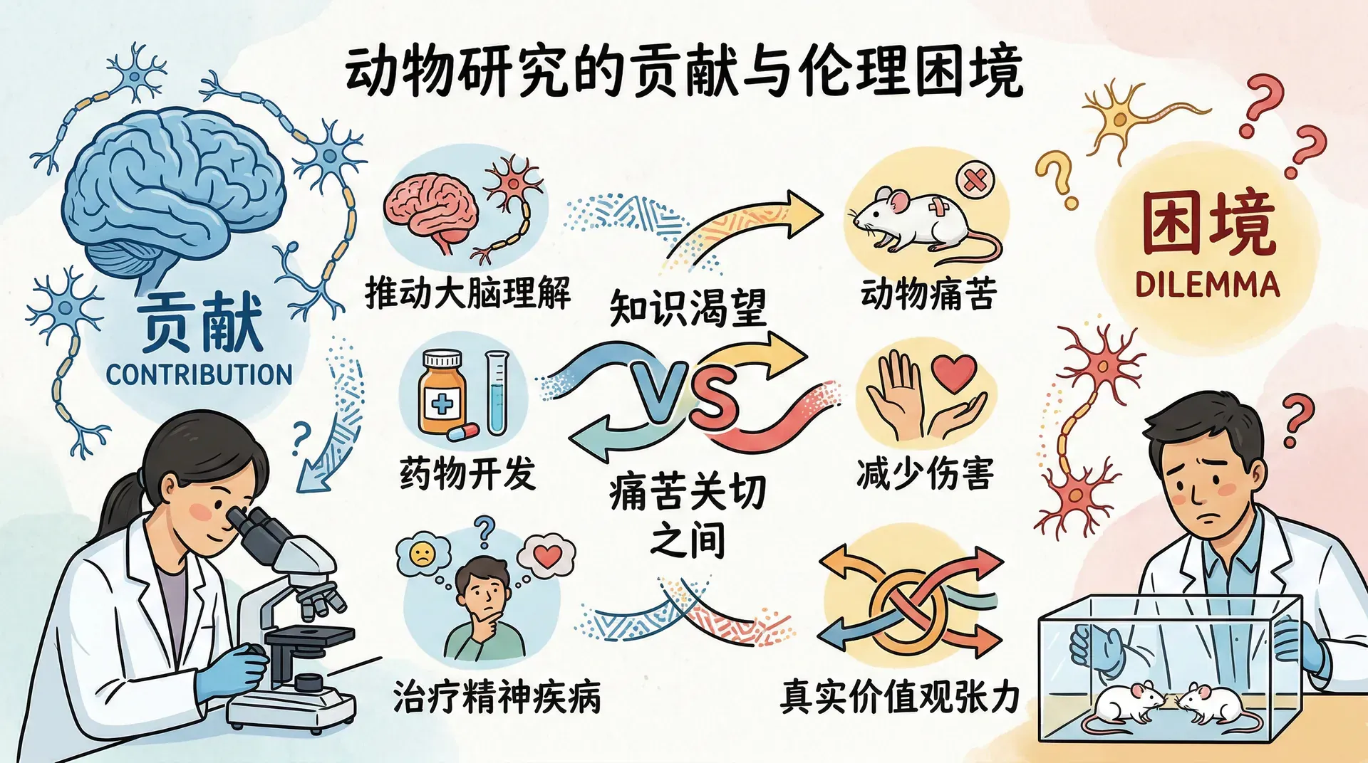 实验室动物研究为我们理解大脑和行为提供了大量不可或缺的知识。从脊髓反射的发现到神经递质功能的阐明,再到各类精神疾病治疗药物的开发,背后几乎都有动物实验的贡献。然而,这种研究同时也带来了一个真实的伦理困境:一方面是对知识的渴望,另一方面是对减少动物痛苦的关切,两者之间并不总是能够和平共处。这不是非黑即白的问题,而是两种真实价值观之间的张力。