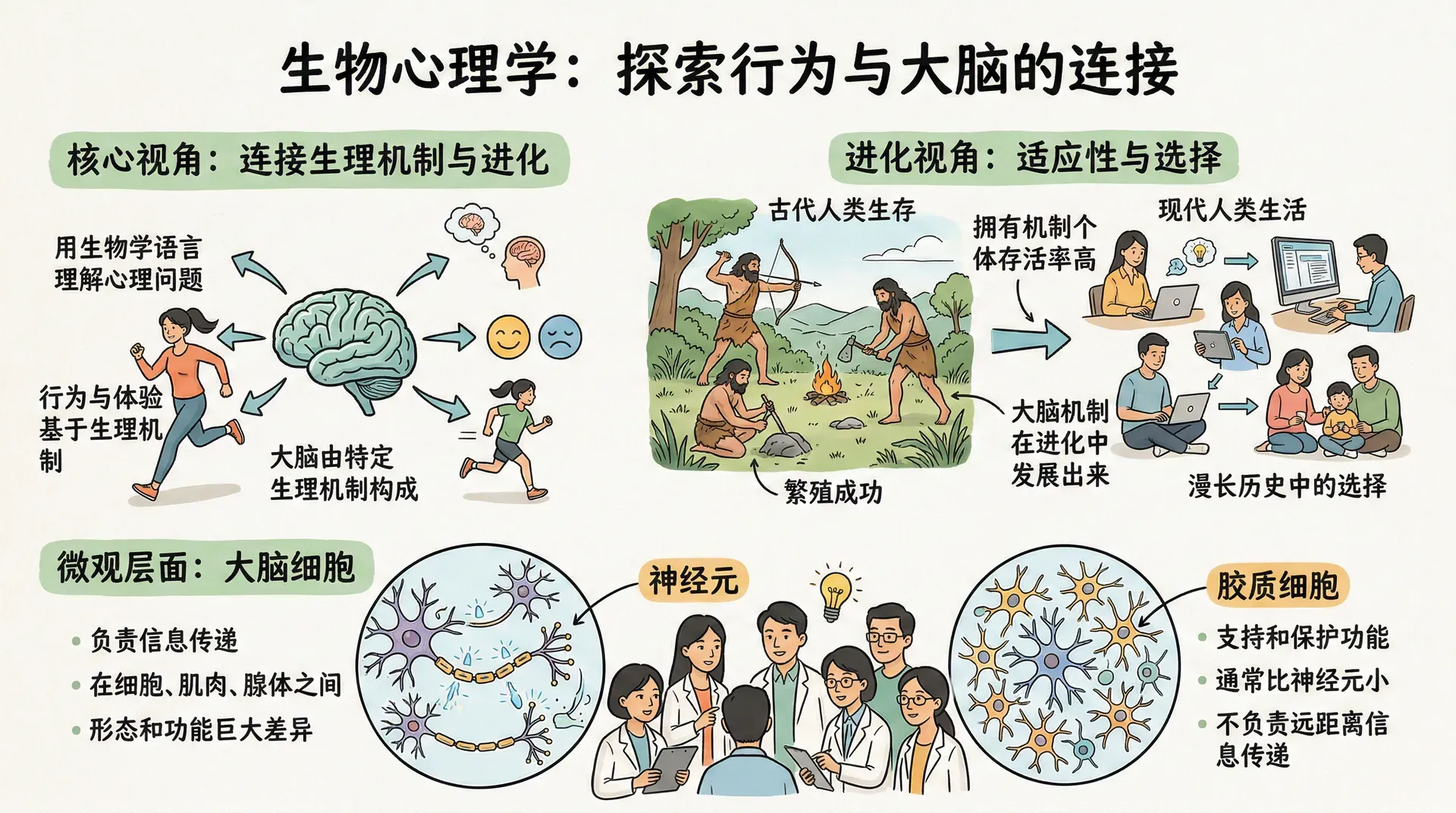 生物心理学并不是要把人简化为一堆化学反应,而是从生理机制、个体发育、进化历史和适应功能这四个维度,去理解行为为何如此、从何而来。