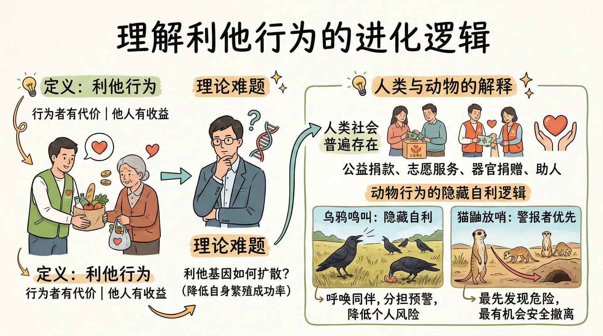 利他行为是指对行为者本人有代价、但对他人有益的行为。从进化角度来看,这类行为面临一个理论上的难题:如果一个基因使个体倾向于帮助他人,却在这个过程中降低了自身的繁殖成功率,那么这个基因如何能在种群中扩散?