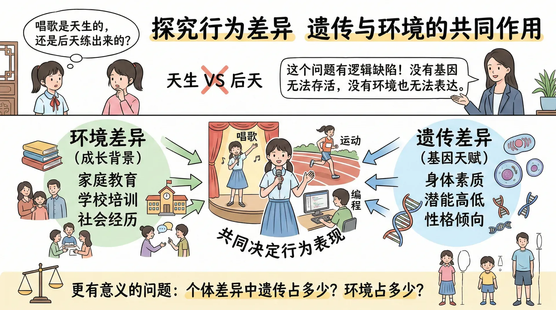 “唱歌能力是天生的还是后天练出来的?”这个问题本身就存在一个逻辑缺陷:没有基因,你甚至无法存活;没有成长环境,基因也无从表达。更有意义的问法是:在现实中观察到的个体差异,有多大比例来自遗传差异,又有多大比例来自环境差异?