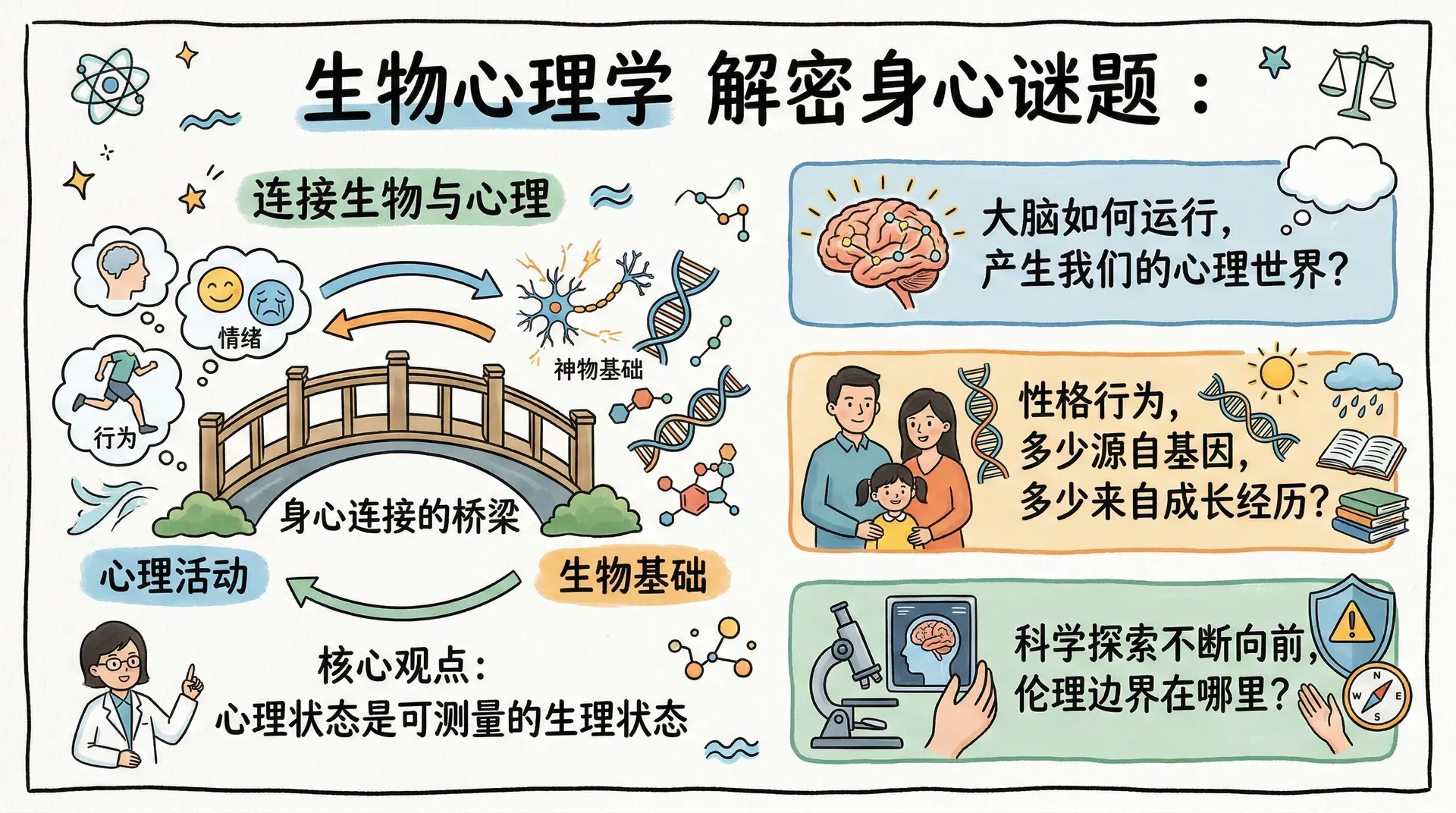 生物心理学是研究行为与体验的生理机制、进化历史及发展过程的科学,与心理生物学、生理心理学、行为神经科学等学科高度重叠。这些名称侧重点略有不同,但共同指向一个核心目标:用生物学的语言来理解心理学的问题。