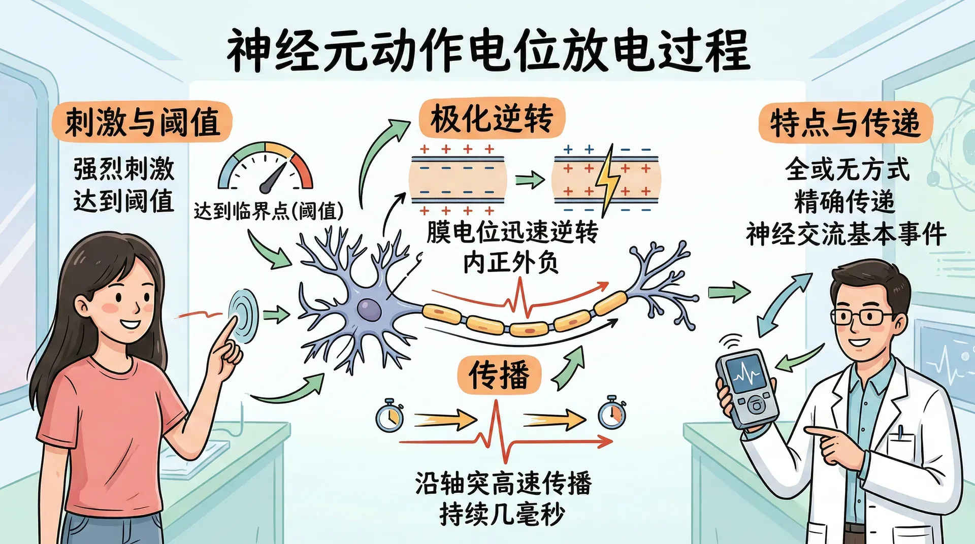 这个过程只持续几毫秒,却足以使信号可靠、高速地从神经元的一端传递到另一端。动作电位的发生标志着神经元“放电”,并将信息以全或无的方式精确传递,是神经系统进行信息交流和调控的基本生物电事件。