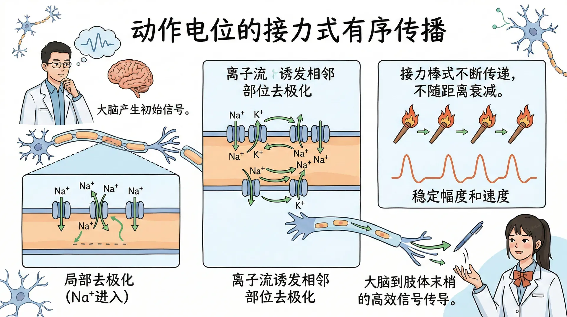 最终,钠钾泵重新建立离子分布,为下一次动作电位做好准备。
