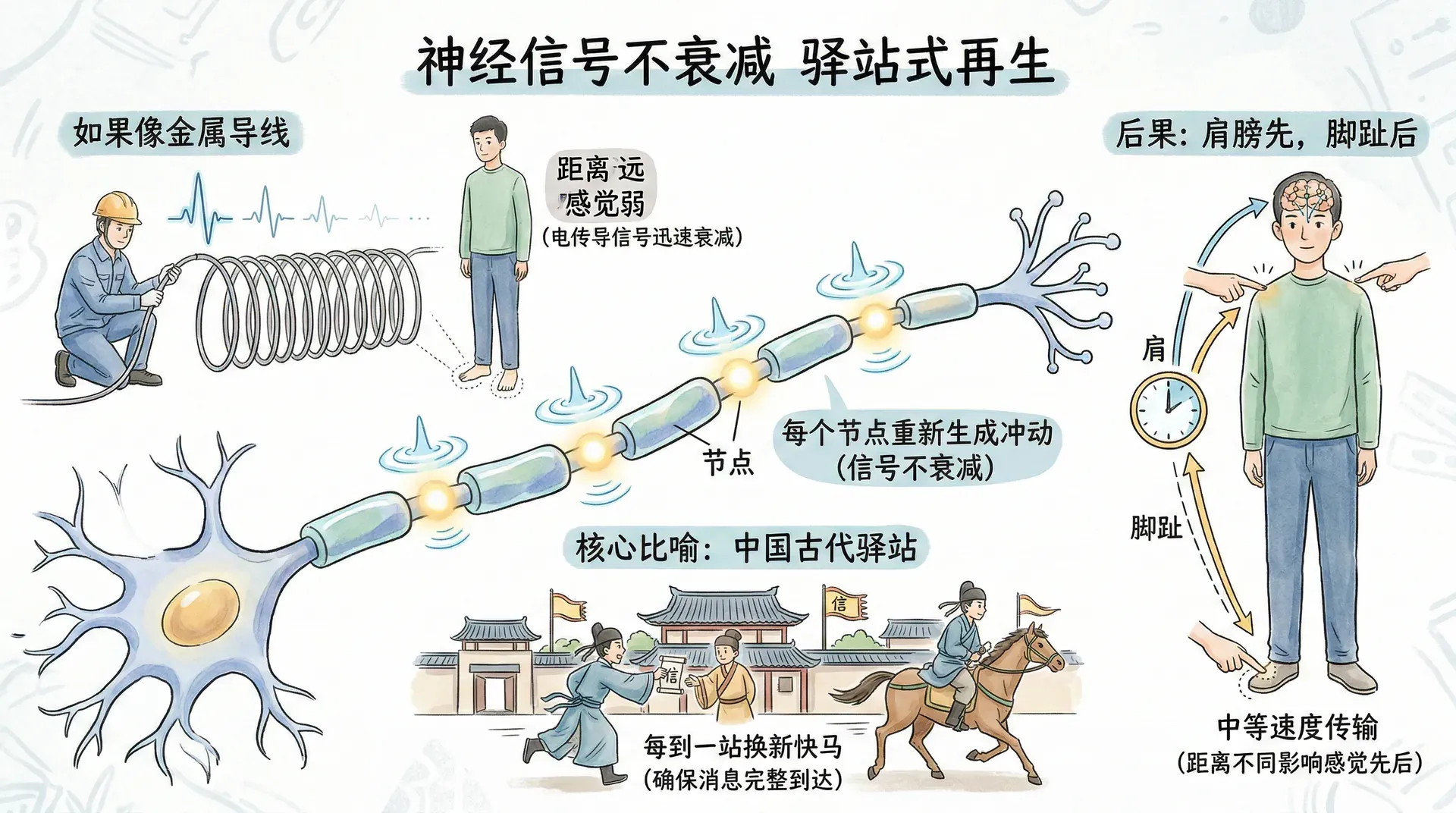 轴突采用了一种避免上述问题的方式:它不是简单地传导电冲动,而是在每个点上重新生成冲动。这就像中国古代的驿站传信,每到一站换新的快马,确保消息能够完整地传到目的地。冲动沿轴突传播而不会衰减,因为每个节点都重新生成了它。