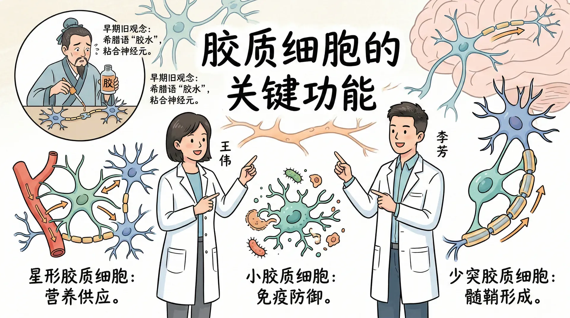 除了神经元,神经系统还包含另一类重要细胞——胶质细胞。它们的名字来源于希腊语中的“胶水”一词,因为早期研究者认为它们将神经元粘合在一起。虽然这种理解已经过时,但名称保留了下来。胶质细胞比神经元小,数量却更多,虽然不负责远距离信号传递,却执行着许多不可缺少的功能。