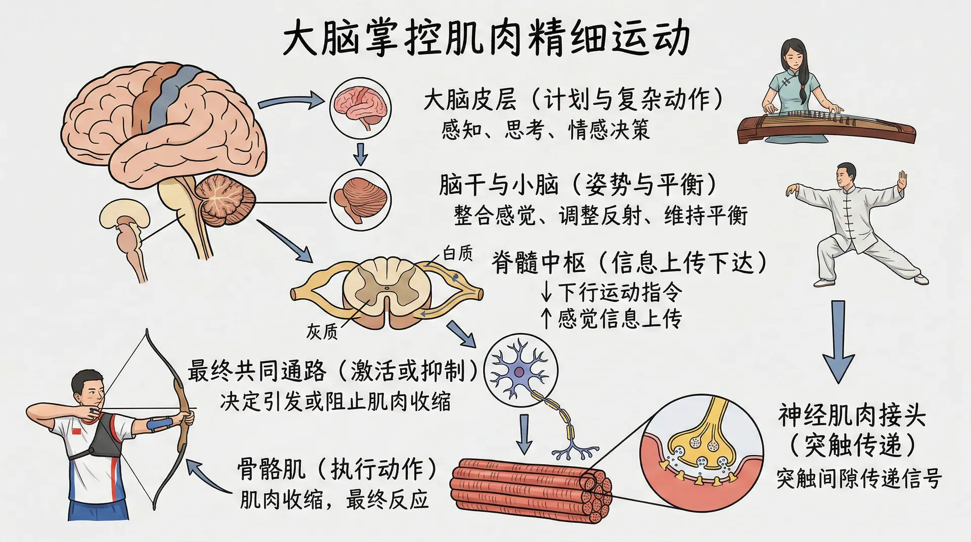 运动控制是神经科学中最基础也最核心的议题之一。理解运动控制,不仅要了解肌肉如何收缩,还要理解大脑如何发出指令、脊髓如何传递信号、身体各部位如何协调配合。这一切构成了人类一切行为的生理基础。