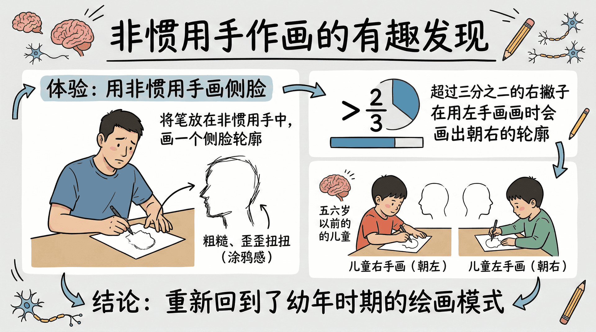 你可能发现画出来的东西比平时粗糙许多,线条歪歪扭扭,像是小学生的涂鸦。更有意思的是,如果你是右撇子用左手画画,多半会画出一个朝右的侧脸。研究发现,超过三分之二的右撇子在用左手画画时都会画出朝右的轮廓,重新回到了幼年时期的绘画模式——五六岁以前的儿童用右手画画时几乎总是画朝左的人和动物,用左手时则几乎总是朝右。