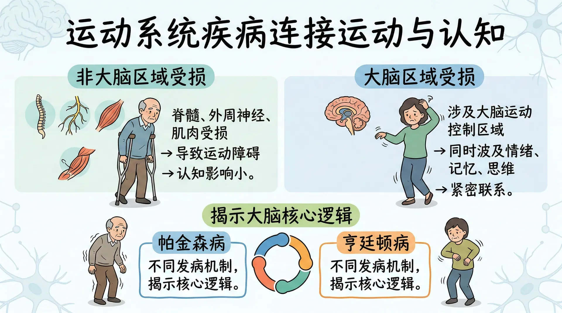 脊髓、外周神经或肌肉本身受损,会导致运动障碍,但认知功能通常不受太大影响。与此不同,涉及大脑运动控制区域的疾病,往往同时波及情绪、记忆和思维能力。这一现象本身就提示我们,运动系统与认知系统之间的联系远比我们想象的紧密。帕金森病和亨廷顿病是两种最具代表性的运动系统疾病,它们的发病机制截然不同,却都揭示了大脑控制运动的核心逻辑。