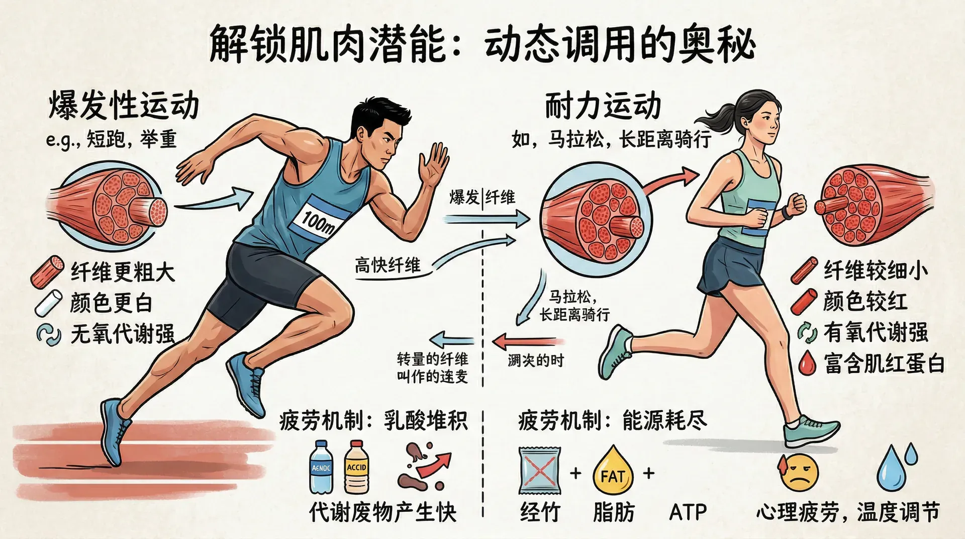 人体的运动并不只依赖于单一种类的肌肉纤维,而是根据运动强度和持续时间,动态调用不同类型的纤维。理解这种差异,有助于解释为什么有些人天生适合长跑,有些人则更擅长爆发性运动。