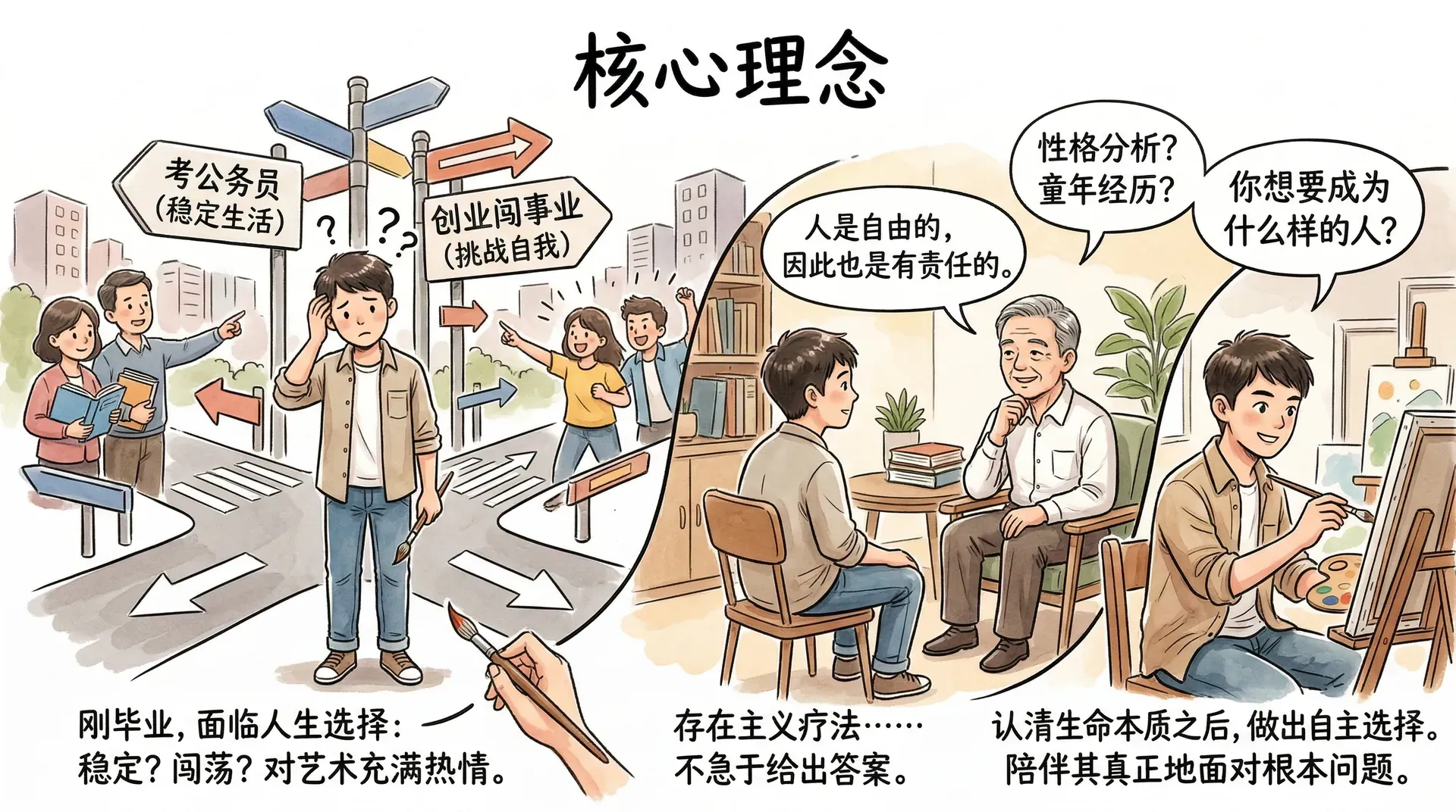 一个刚大学毕业的学生站在人生十字路口,父母希望他考公务员求稳定,朋友建议他创业闯事业,而他自己对艺术充满热情。传统心理治疗可能会分析他的性格特点或童年经历,但存在主义疗法会直接面对这个根本问题:你想要成为什么样的人?它不急于给出答案,而是陪伴这个人真正地面对这个问题。