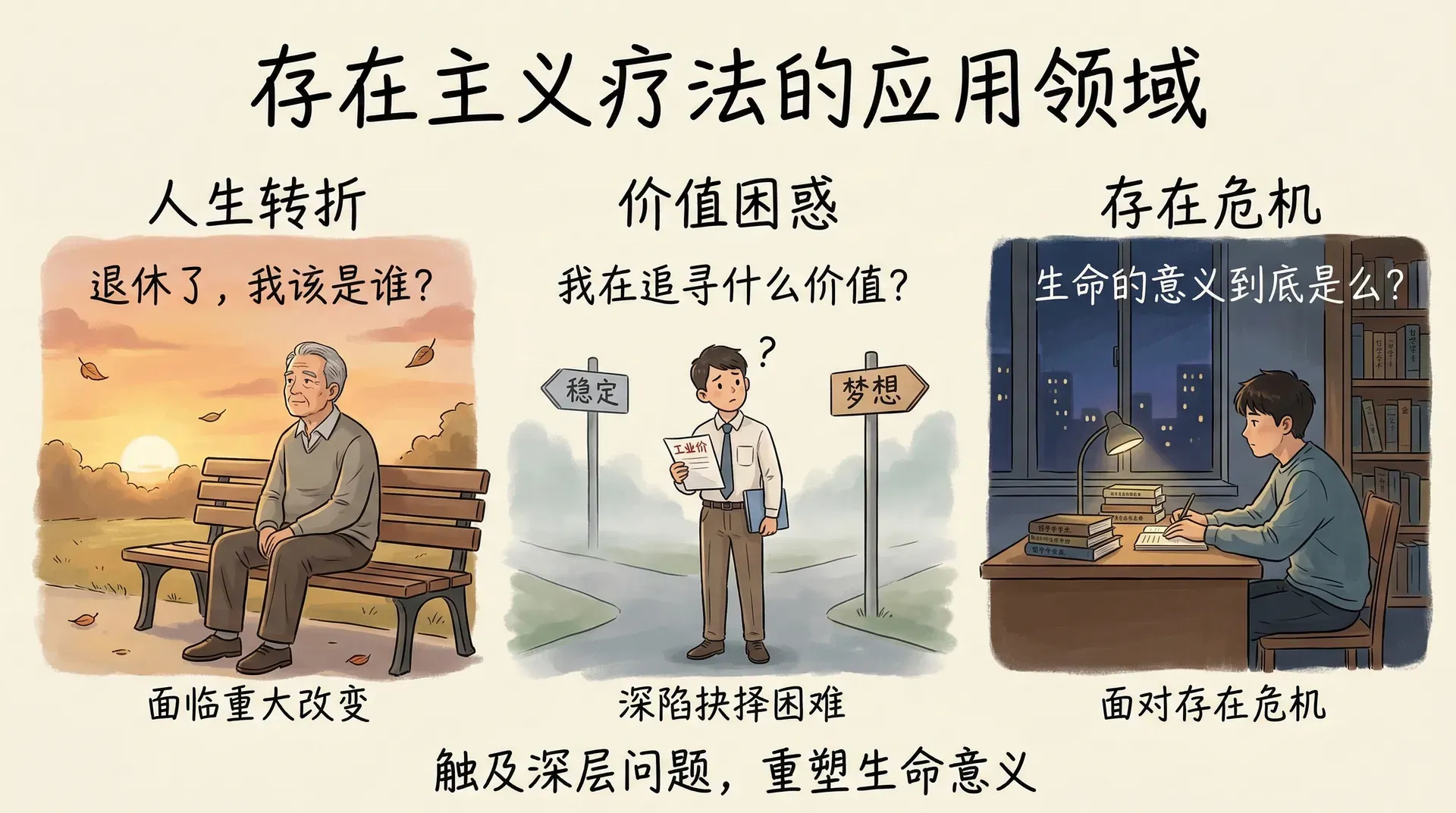 存在主义疗法因其独特的哲学基础和灵活的实践方式,在多个领域都有广泛应用。它特别适合那些面临人生转折、价值困惑或存在危机的人群,在这些情境中,存在主义疗法往往能够触及其他疗法难以抵达的深层问题。