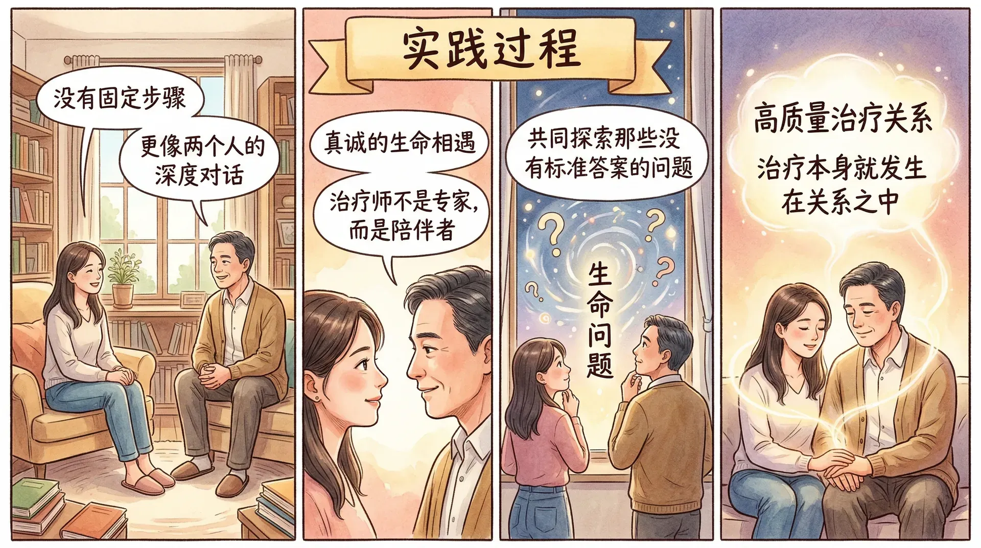 存在主义疗法不像认知行为疗法那样有固定步骤和操作手册,它更像是两个人之间的深度对话——一种真诚的生命相遇。治疗师不是居高临下的专家,而是陪伴者,与来访者一起探索那些没有标准答案的问题。这种疗法对治疗关系的质量有很高要求,因为治疗本身就发生在这段关系之中。