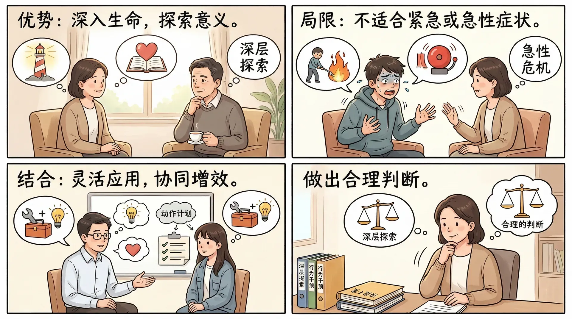 存在主义疗法有其独特的价值,也有不可忽视的边界。了解这些优势和局限,有助于在实践中做出更合理的判断,知道什么时候这种疗法最适合,什么时候需要结合其他方法,或者先采用其他干预手段。