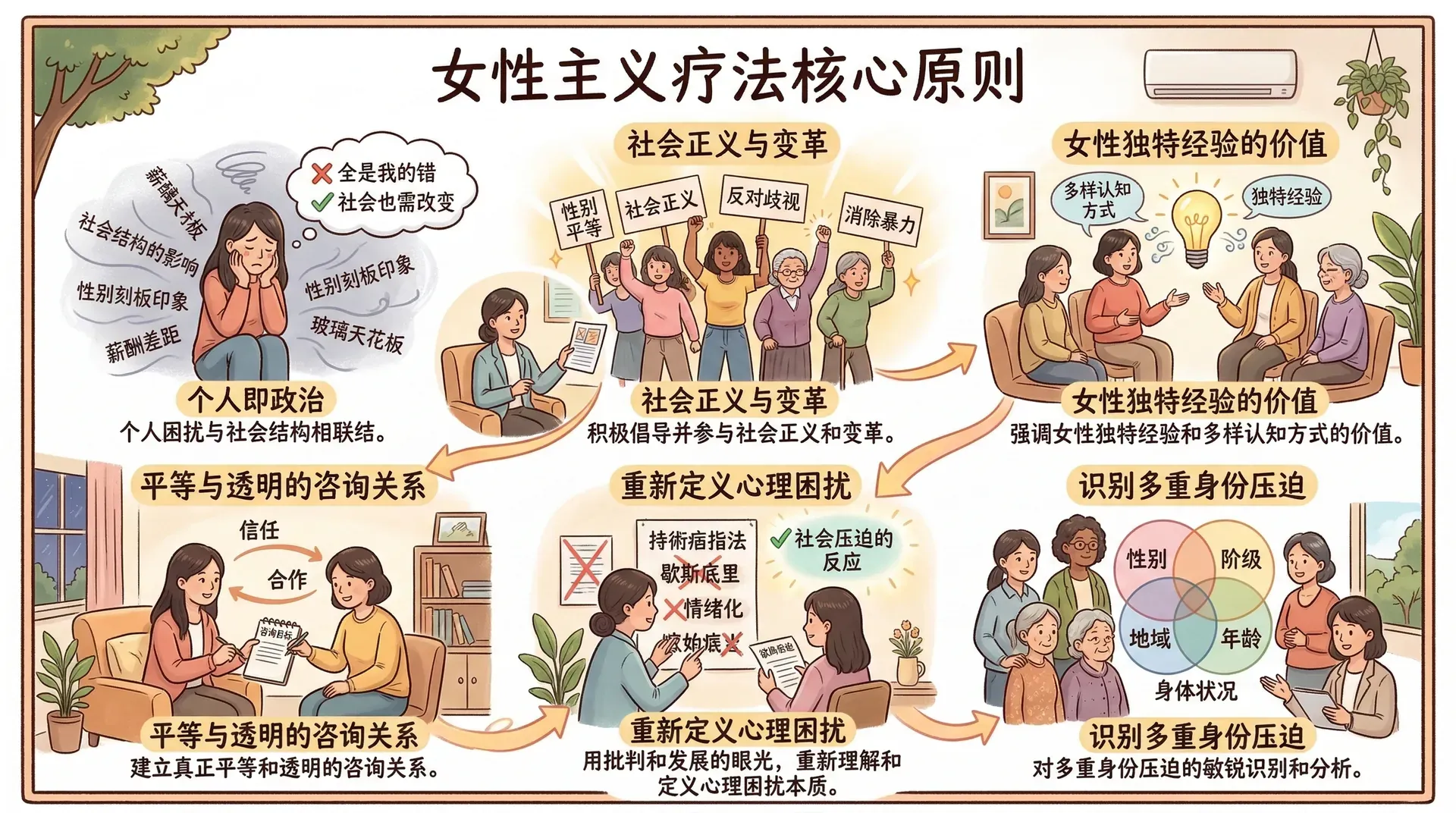 真正理解个人心理困扰,需要考虑导致这些问题的社会、文化和政治背景,而非简单归因于个人缺陷。这是女性主义疗法区别于许多传统疗法的根本立场。