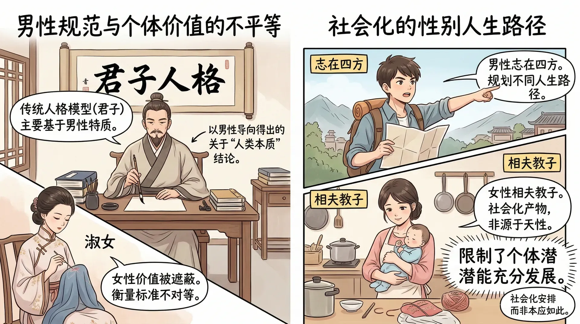 以男性导向的构念去得出关于“人类本质”的结论,这本身就是一种遮蔽。国内传统文化中,“君子”作为理想人格的模型,几乎完全建立在男性特质之上,女性被期望符合“淑女”的标准,个体价值的衡量方式从根本上就是不对等的。