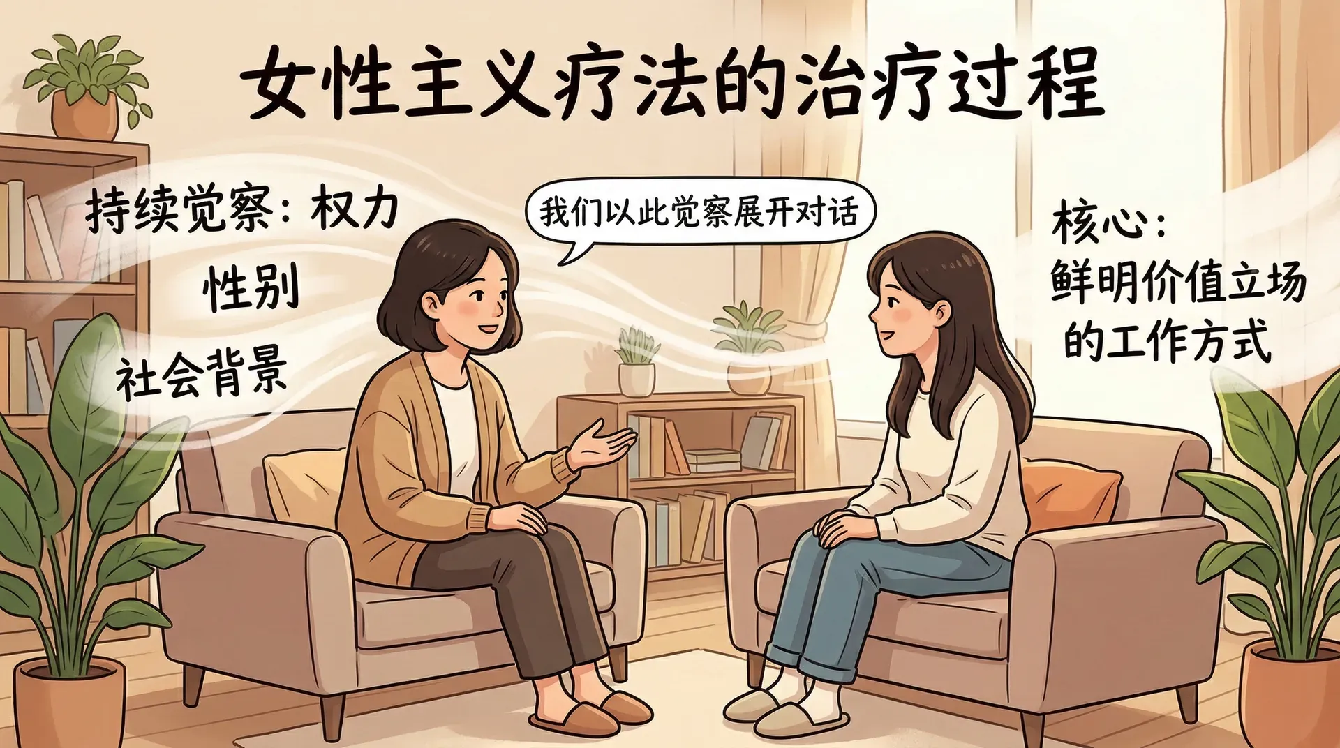 女性主义疗法的治疗过程,不是一套固定的技术流程,而是一种有着鲜明价值立场的工作方式。治疗师带着对权力、性别与社会背景的持续觉察进入咨询关系,并以此为基础展开每一次对话。
