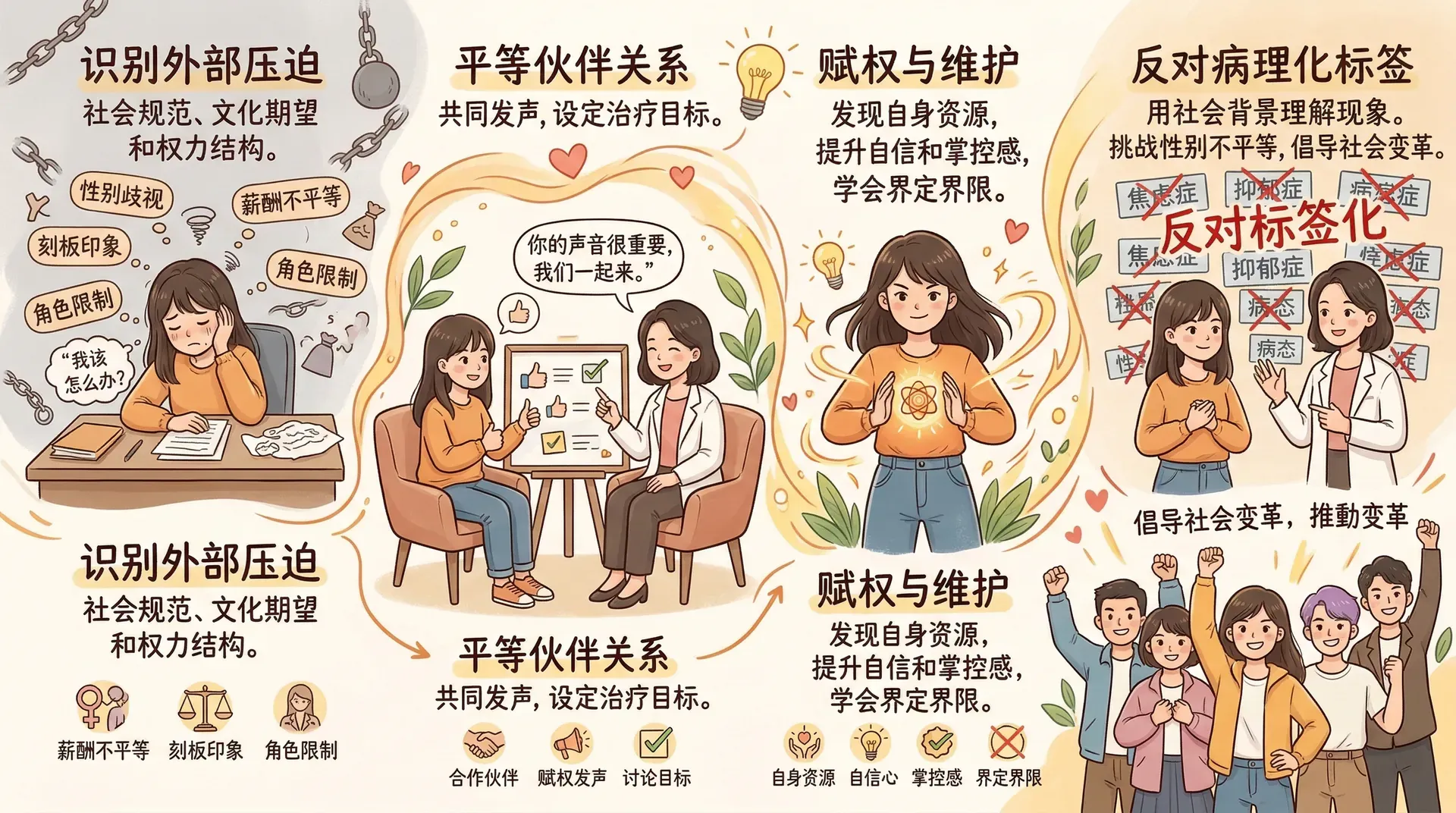 在国内,这一疗法具有特别的现实意义。它帮助女性认识到个人困扰背后的社会文化根源,帮助在传统价值观与现代生活期望之间两难的人找到属于自己的平衡,也在推动职场和家庭内部性别关系朝向更公平的方向发展。