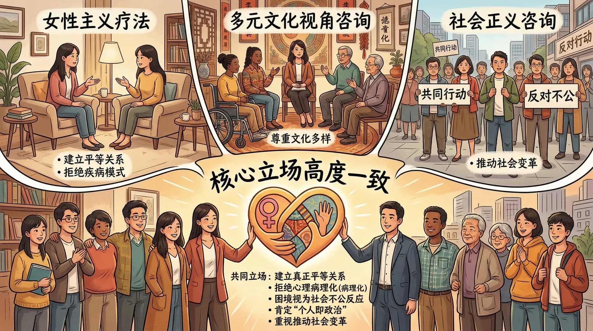 女性主义疗法、多元文化疗法和社会正义咨询,虽然在历史起源和具体侧重上各有不同,但在根本立场上高度一致:三者都致力于在咨询关系中建立真正的平等,都拒绝心理病理学的“疾病模式”,而将来访者的困境理解为生活在不公正社会环境中所产生的合理反应。“个人即政治”这一原则,在每一种方法中都得到明确的肯定,对直接行动推动社会变革的重视,也是三者共同的实践取向。