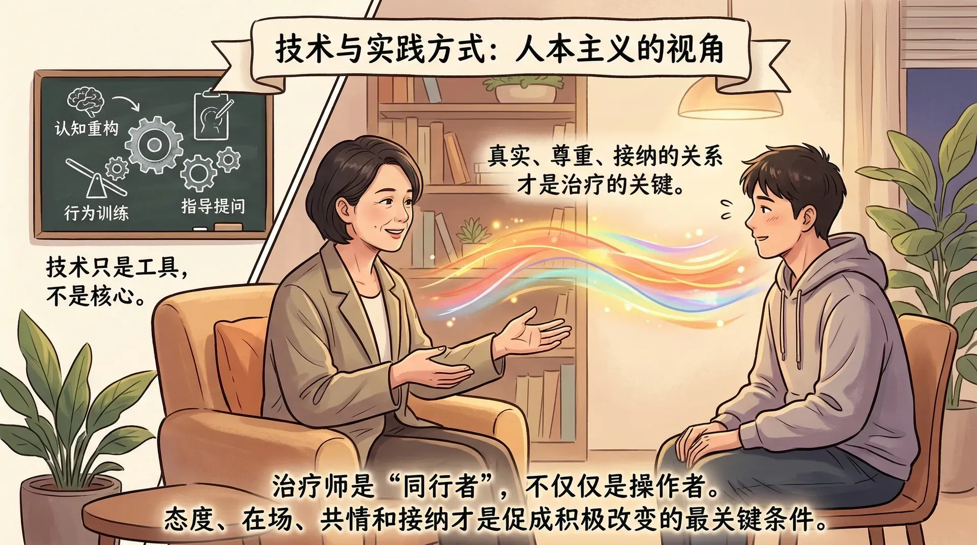 人本主义疗法没有一套规定的操作程序,与来访者充分同在、进入他的感知和感受世界,这种存在质量本身就足以促进改变。这并不意味着人本主义治疗师排斥所有具体的技术手段,而是说,技术只有在服务于真实关系的前提下才有意义。如果某种技术有助于治疗师更深入地理解来访者,或者有助于来访者接触自己的内心,那它就可以被使用;如果技术变成了回避真实相遇的手段,它就失去了意义。