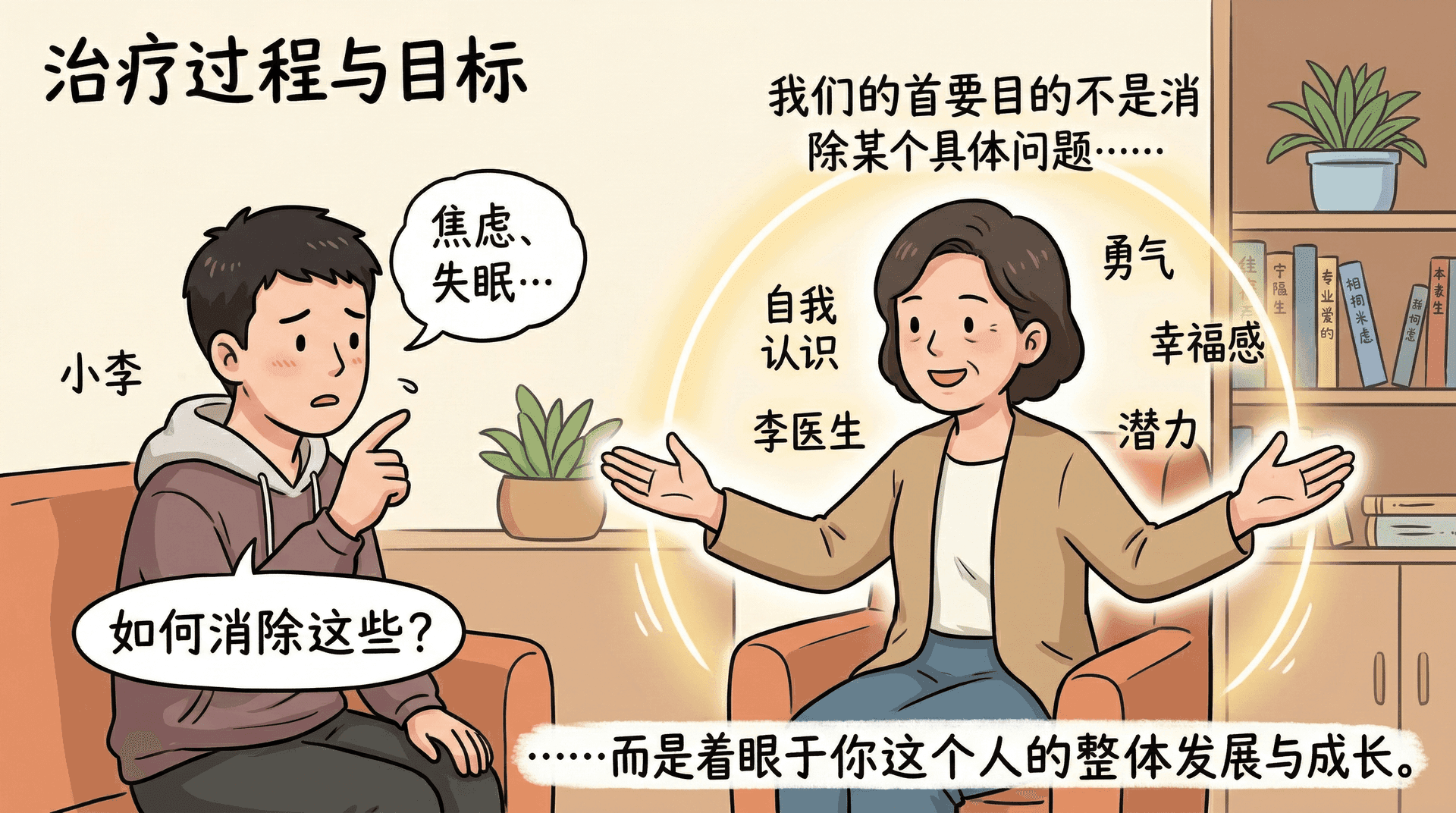 人本主义疗法的治疗目标与其他许多取向有所不同——它不以消除某种症状或解决某个具体问题为首要目的,而是着眼于来访者这个人的整体发展与成长。理解这一点,有助于把握人本主义咨询在实际工作中如何展开。