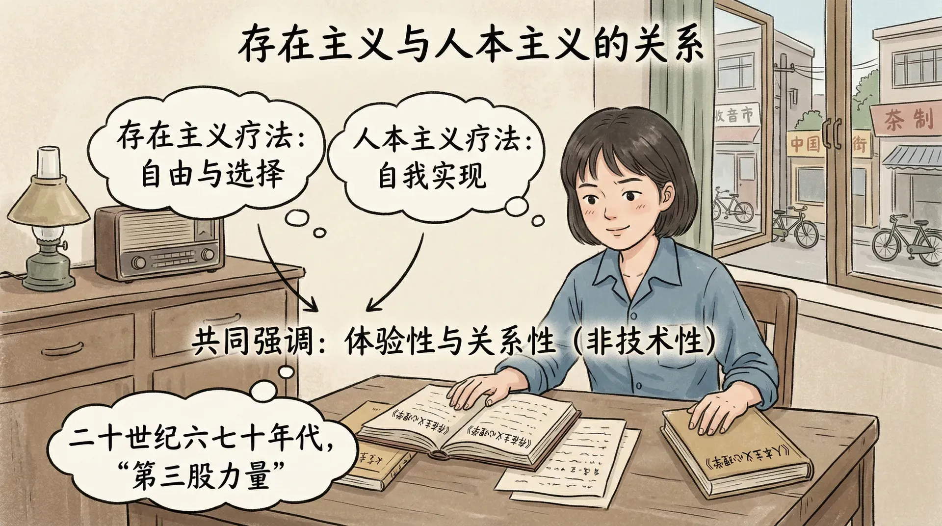 两者对治疗技术的态度也相近,都认为技术本身并不是改变的核心,真正重要的是治疗师与来访者之间的真实相遇。自由、选择、个人责任、生命意义这些概念,在两种取向中都占有核心地位。