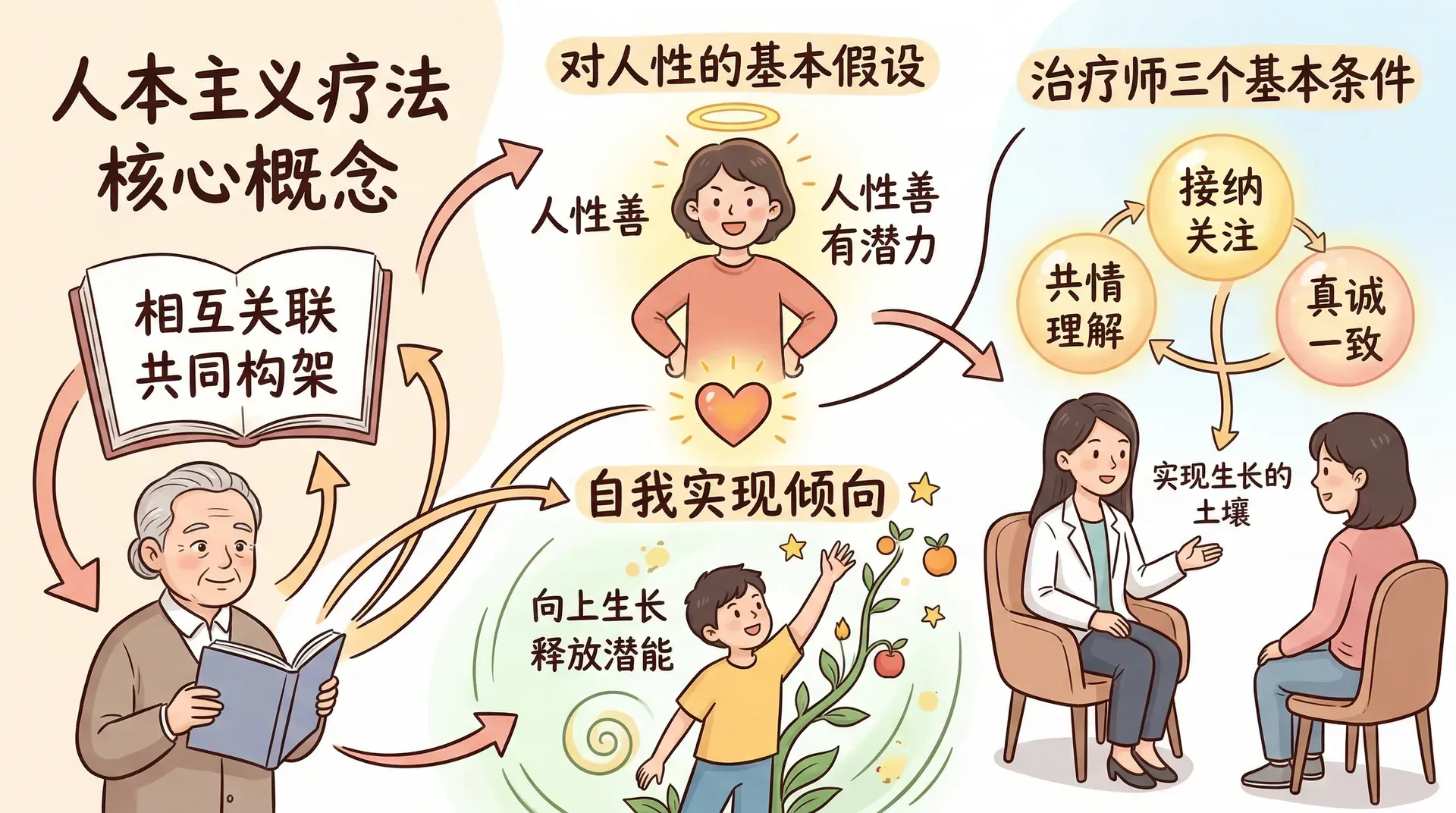 人本主义疗法的实践建立在一套清晰的理论基础之上。这些概念彼此关联,共同构成了理解人本主义疗法如何运作的框架。其中最为核心的,是对人性的基本假设、自我实现倾向的理论,以及治疗师需要具备的三个基本条件。