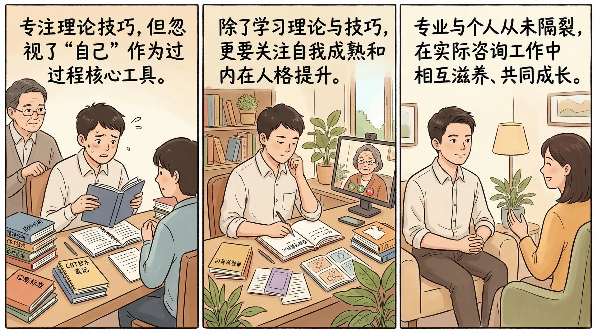 在心理咨询师的成长道路上,个人成长与专业发展始终是密不可分的两个方面。许多新手咨询师常常关注专业理论、技术和方法,但很容易忽视了“自己”作为咨询过程核心工具的重要性。本节将带领大家探讨:成为一名真正有效的心理咨询师,除了学习理论与技巧,更要关注自我的成熟和内在的人格提升——因为专业与个人其实从未相互割裂,而是在实际咨询工作中相互滋养、共同成长的。