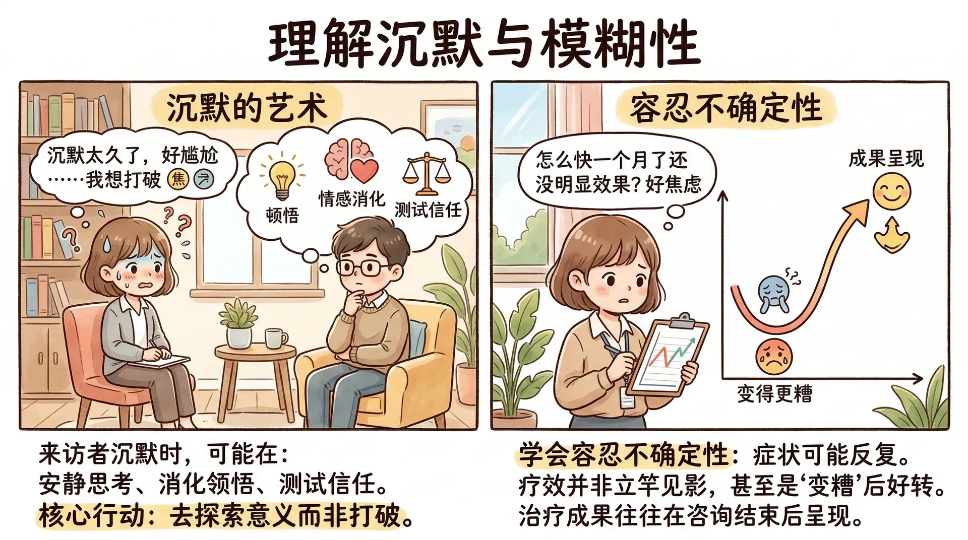 治疗过程中的沉默对于新手治疗师来说可能感觉像是漫长的煎熬,但沉默可能有多种含义。来访者可能正在安静地思考之前讨论过的事情,或者在消化刚刚获得的某种领悟,也可能是在评估是否可以信任眼前这个人。沉默可以令人耳目一新,也可以令人不知所措。当沉默发生时,与来访者一起确认和探索沉默的意义,比急于打破沉默要有价值得多。