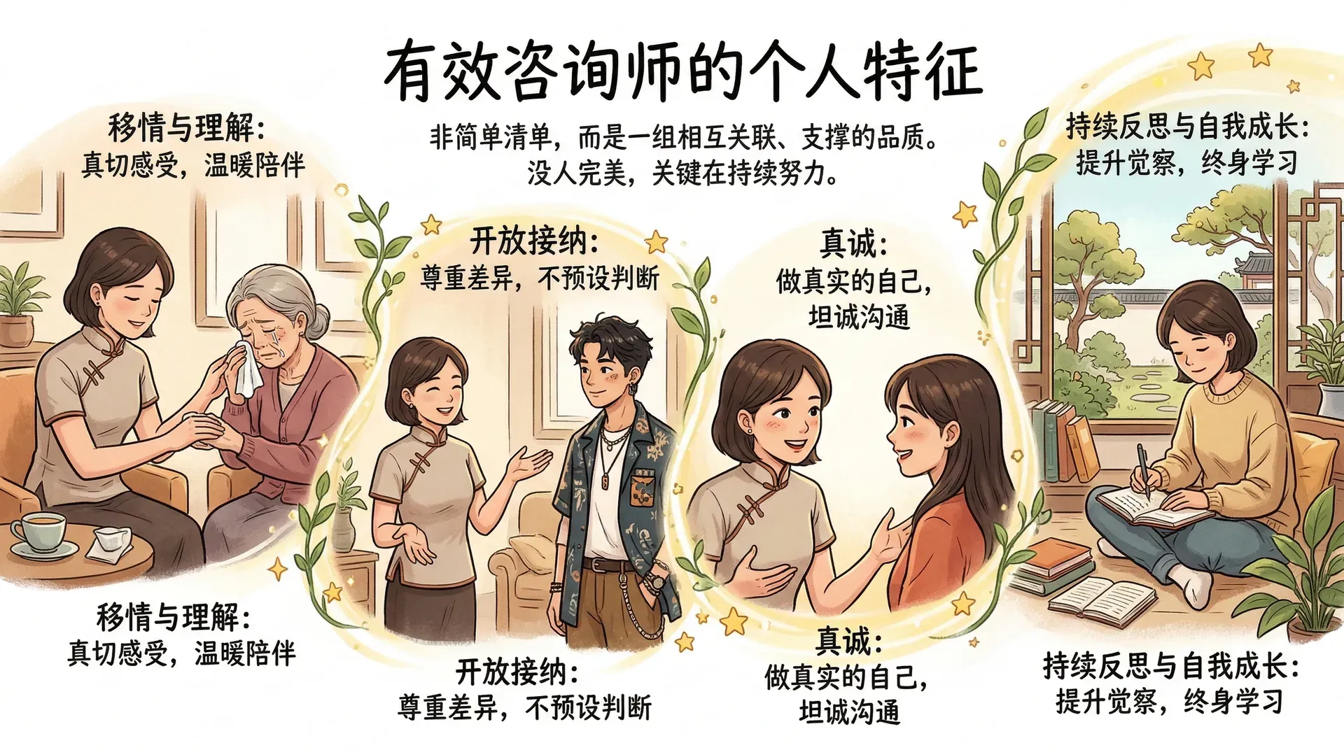 成为有效咨询师需要具备哪些个人特质?这不是一张简单的清单,而是一组相互关联、彼此支撑的品质。没有人能完美体现所有特质,关键在于是否愿意朝这个方向持续努力。以下几个方面可以作为自我成长的参考。