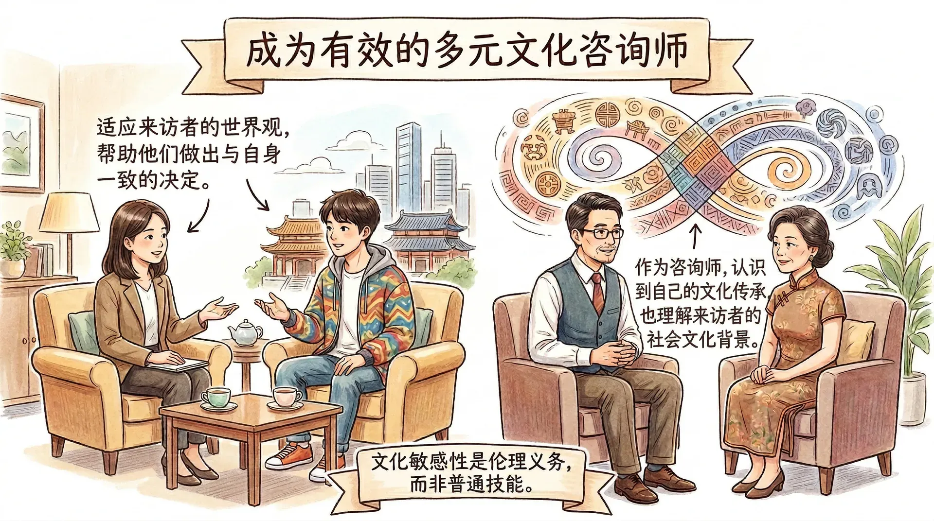 成为有效咨询师的过程,包括学习识别多样性议题,并调整咨询实践以适应来访者的世界观。学习对文化差异保持敏感,不仅仅是一种专业技能,更是一种伦理义务。治疗师的角色是帮助来访者做出与他们自己世界观一致的决定,而不是引导来访者按照治疗师的价值观生活。