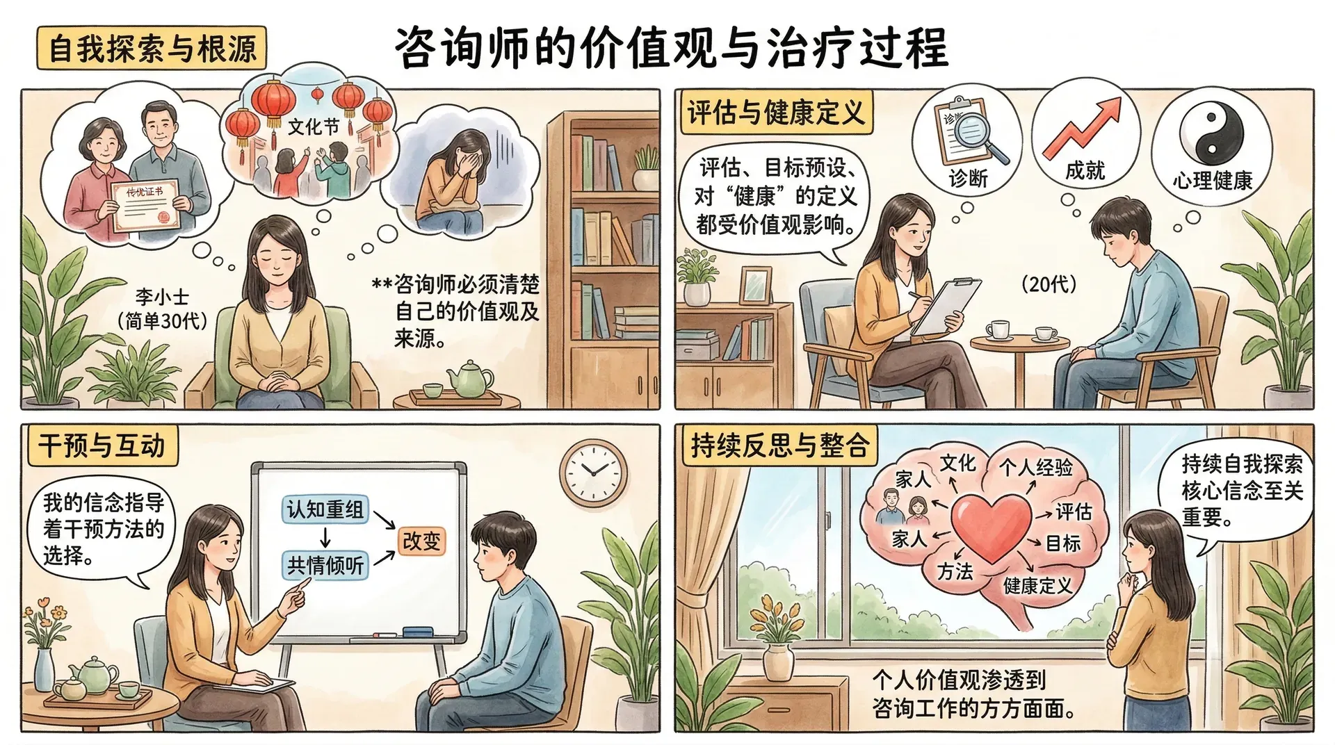 咨询师的个人价值观会在多个层面影响咨询过程。首先,价值观影响咨询师如何看待咨询目标、选择干预方法、解读来访者的行为等。其次,咨询师的价值观会通过言语和非言语方式传递给来访者,有时是无意识的。