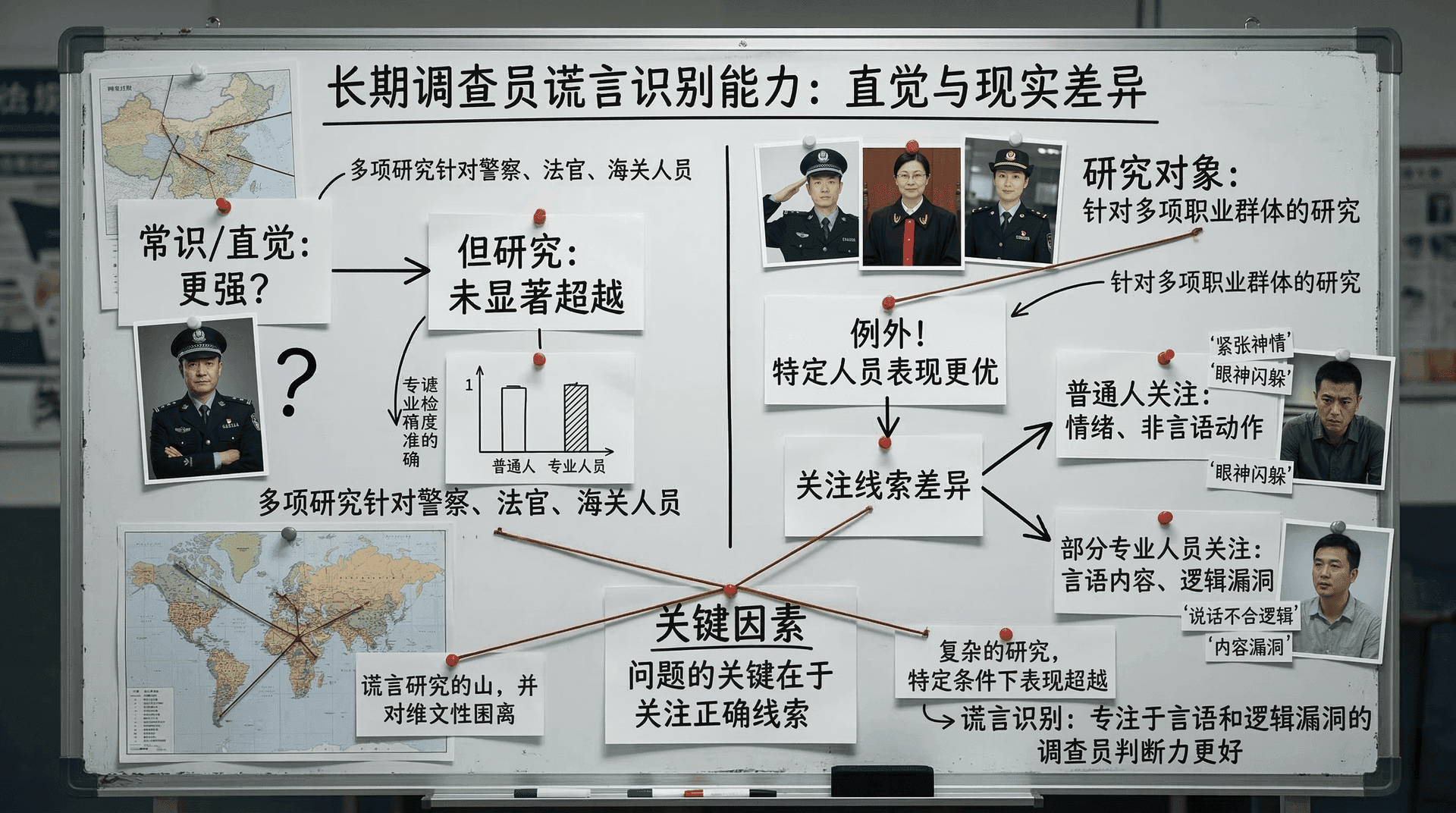 研究发现,这批警察的平均识别准确率为六成五,显著高于随机水平。其中谎言的识别率约为六成六,真话的识别率约为六成四。更关键的发现是:表现较好的警察有一个共同点,他们都更关注嫌疑人说话的内容和逻辑,而非身体动作。