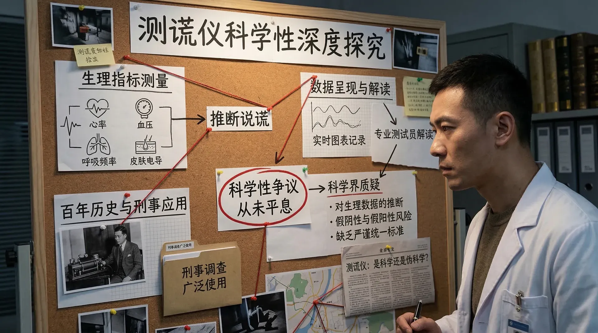 测谎仪通过同时测量多项生理指标——包括心率、血压、呼吸频率和皮肤电导——来推断被测者是否说谎。这些生理数据被实时记录并呈现在图表上,由专业测试员进行解读。测谎仪的出现至今已有百年历史,在世界各地的刑事调查中有着广泛的应用,但围绕其科学性的争议从未平息。