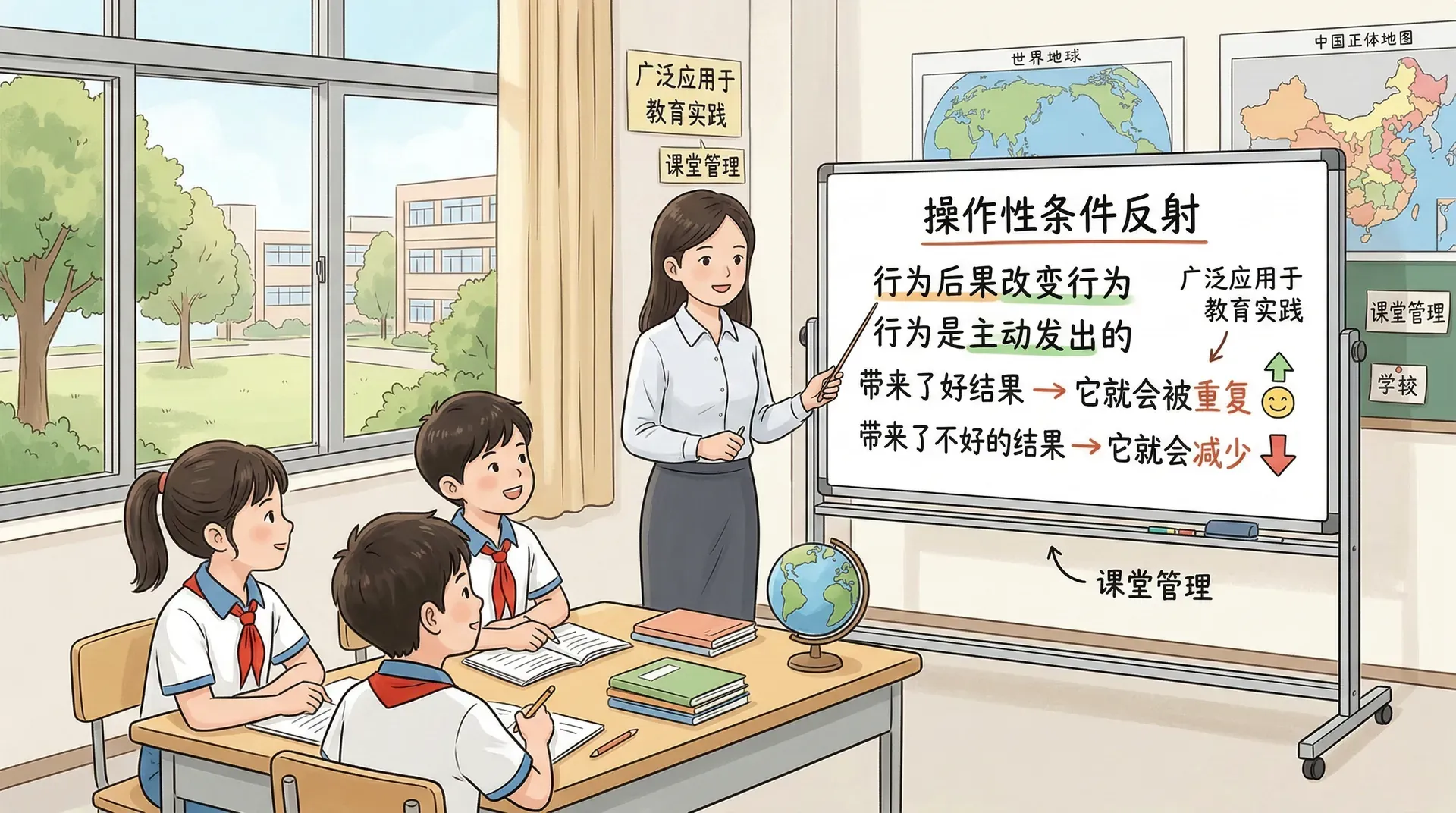 操作性条件反射是行为主义的另一个核心理论,它解释了行为如何因自身产生的后果而发生改变。与经典条件反射不同,操作性条件反射中的行为是学习者主动发出的,其背后的逻辑是:某个行为带来了好的结果,它就会被重复;带来了不好的结果,它就会减少。这一理论在课堂管理和教育实践中有着极为广泛的应用。