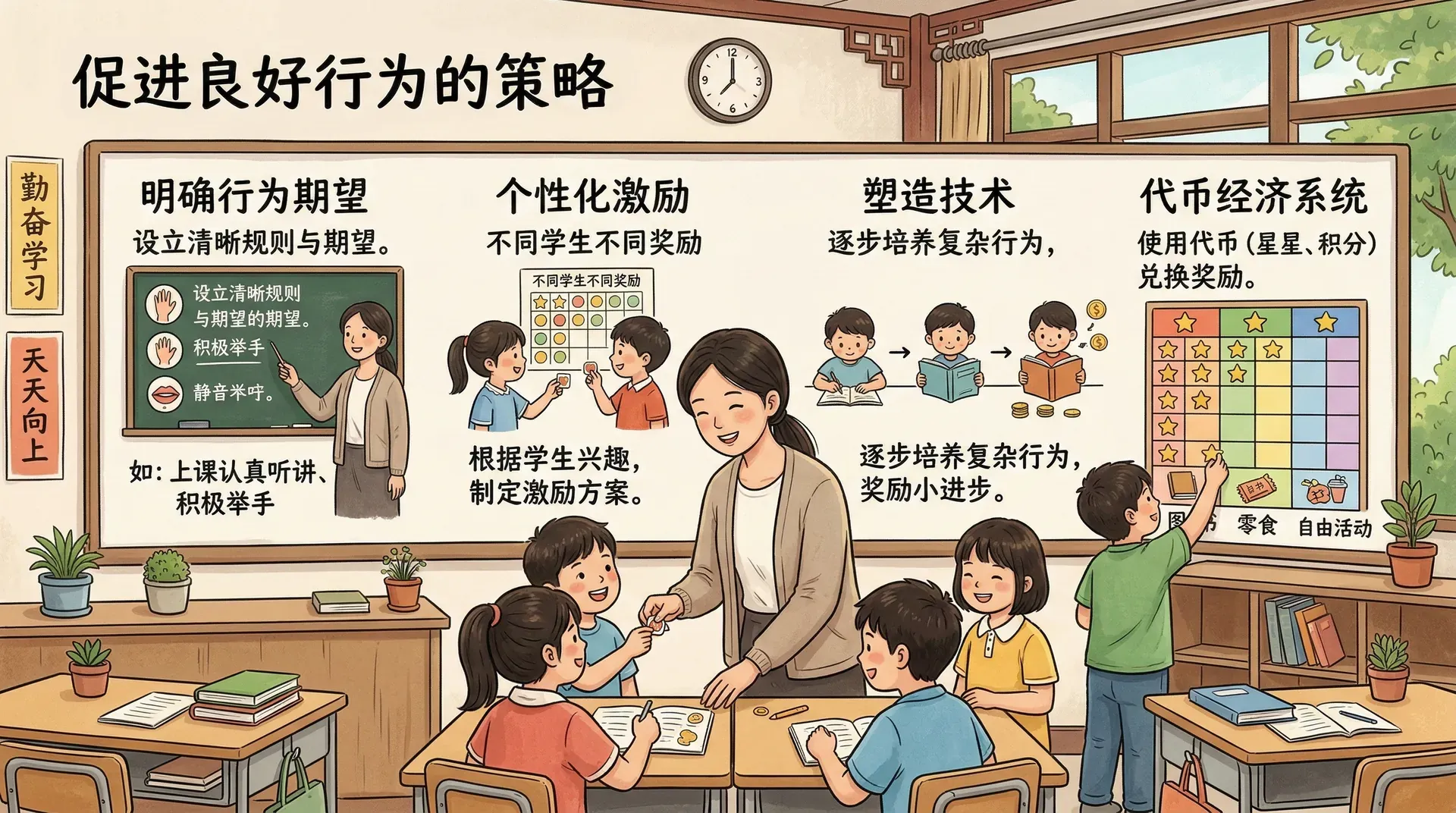在教学实践中,理解了强化的原理之后,更重要的是知道如何系统地运用这些原理来引导学生的行为。这一部分将介绍几种经过实践检验的行为管理策略,包括如何明确行为期望、如何针对不同学生制定个性化的激励方案,以及如何通过塑造技术和代币经济系统来处理更复杂的行为问题。