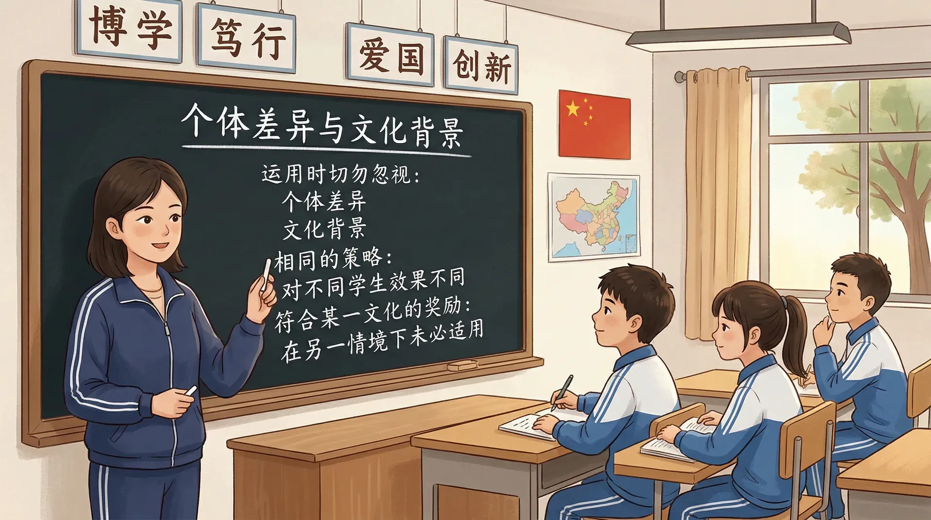 行为主义的原理具有相当的普遍性,但在具体运用时,不能忽视学生的个体差异和所处的文化背景。相同的强化策略,在不同的学生身上可能效果截然不同;符合某一文化价值的奖励方式,放到另一种文化情境下也未必适用。