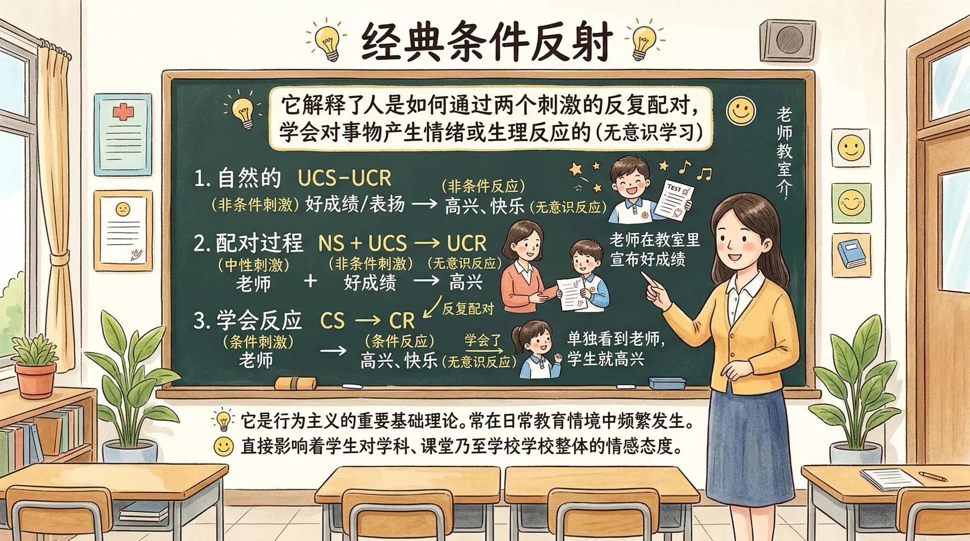 经典条件反射是行为主义的重要基础理论,它解释了人是如何通过两个刺激的反复配对,学会对原本中性的事物产生情绪或生理反应的。这类学习往往不受意识控制,却在日常的教育情境中频繁发生,直接影响着学生对学科、对课堂乃至对学校整体的情感态度。