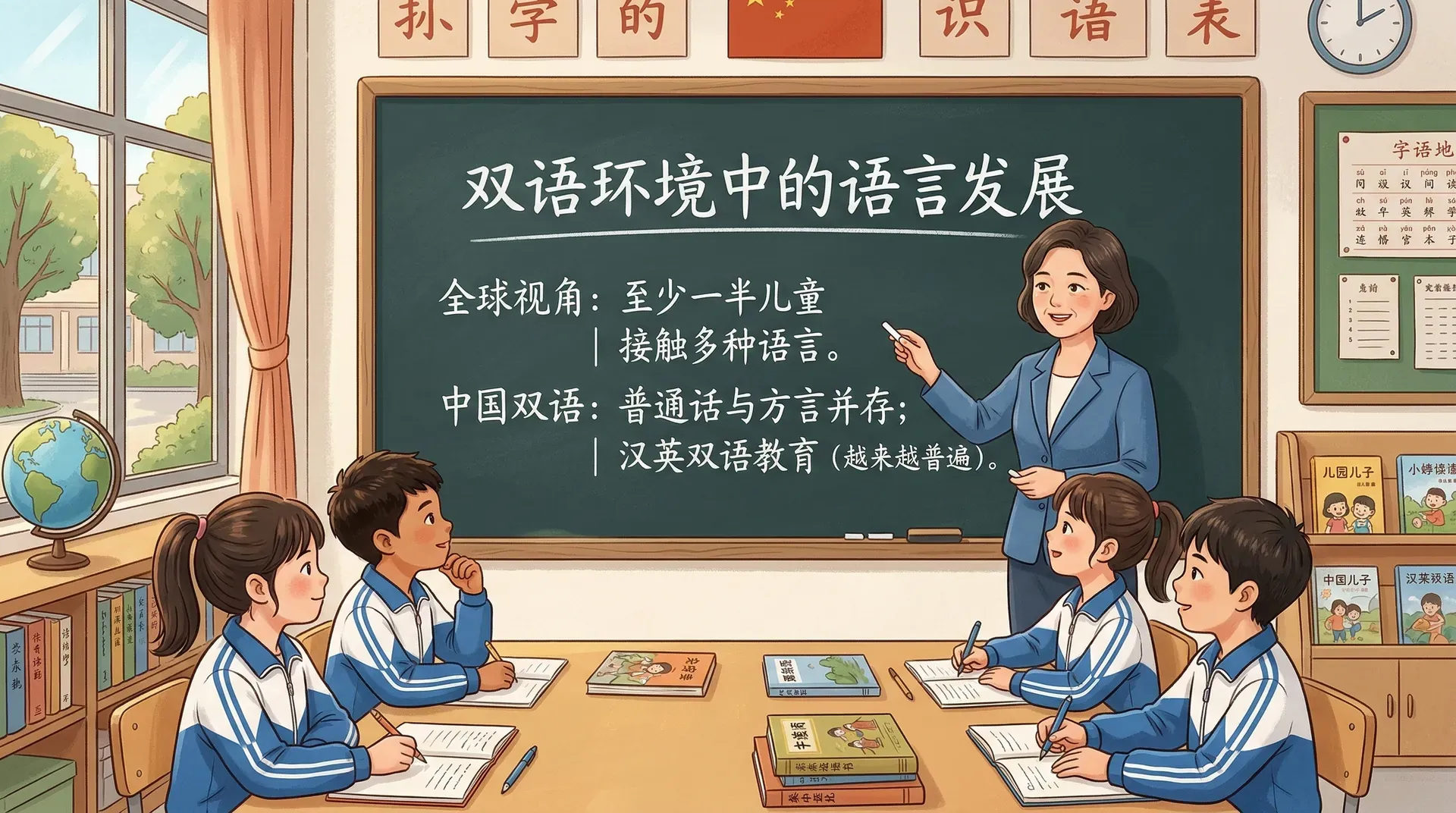 全球范围内,至少有一半的儿童在某种程度上接触多种语言。在中国,双语环境主要体现在两个层面:一是普通话与地方方言的并存,二是越来越普遍的汉英双语教育。