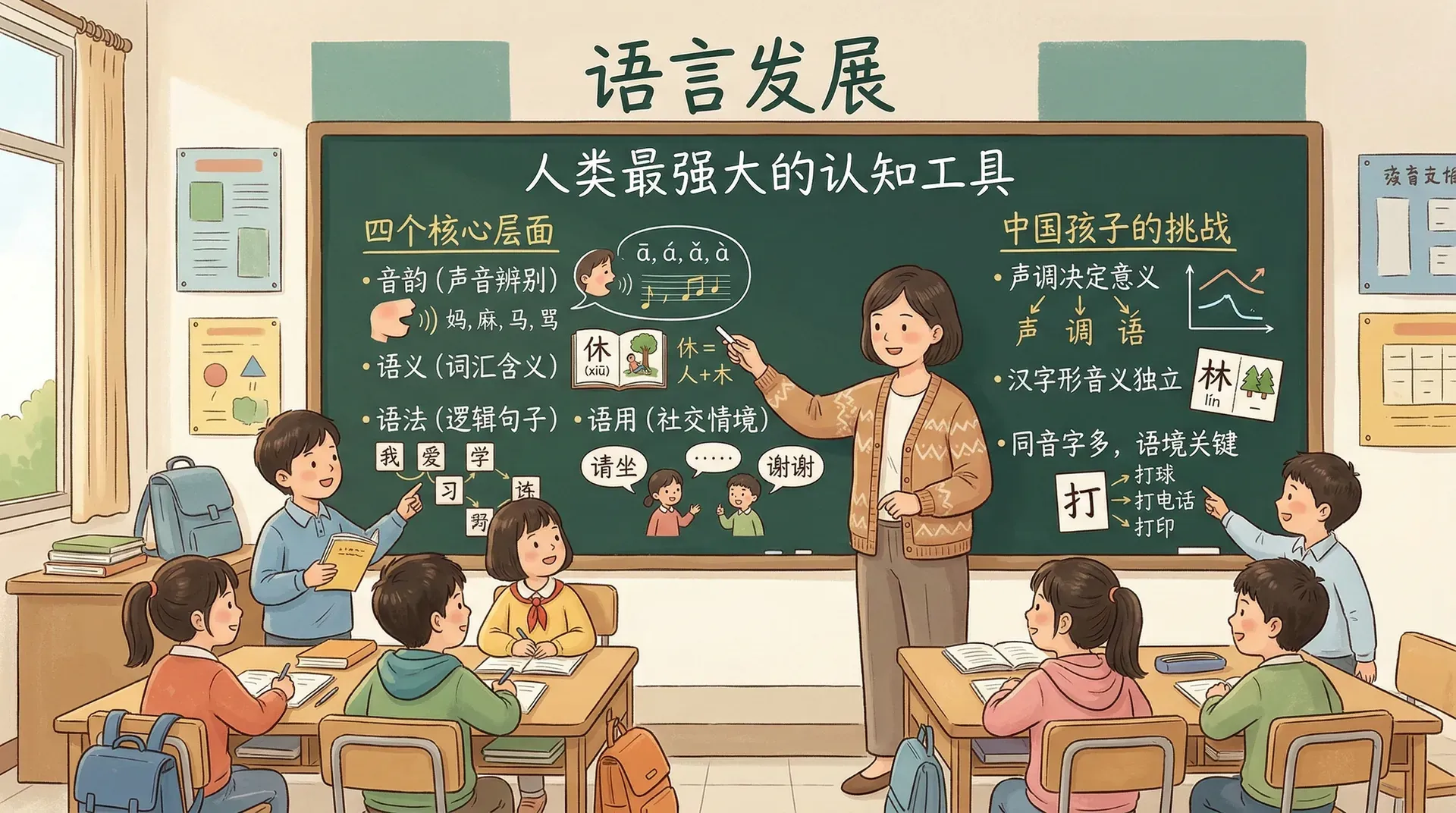 对中国孩子来说,这一挑战更加独特。汉语是声调语言,声调的变化直接改变词语的意义;汉字是表意文字,每个字都有独立的形、音、义,无法像拼音文字那样通过拼读规则推导发音;加之汉语丰富的同音字现象,使得语境理解在汉语习得中格外关键。