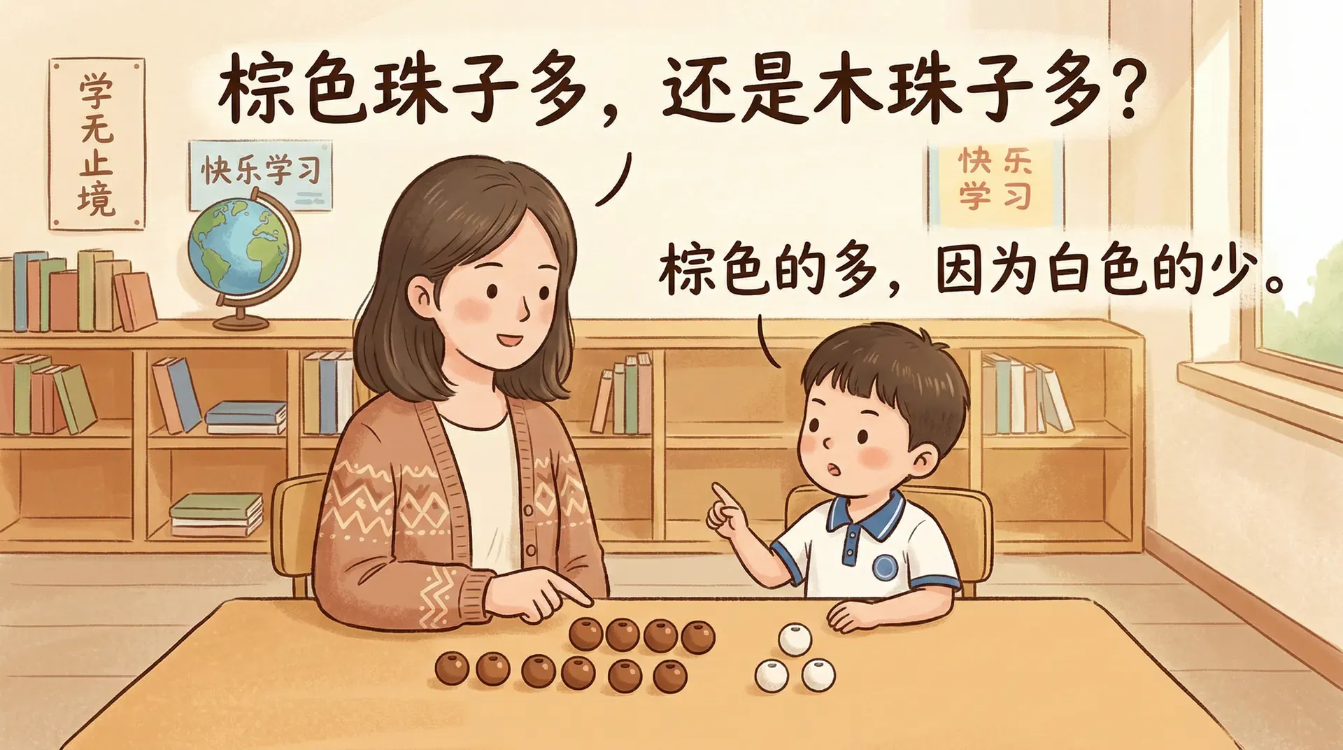 把十二个木珠放在桌上,其中十个棕色、两个白色。问一个六岁的孩子:“棕色珠子多,还是木珠子多?”对成年人来说,答案显而易见——木珠子更多,因为棕色珠子本来就是木珠子的一部分。但很多六岁的中国孩子会毫不犹豫地回答:“棕色的多,因为白色的只有两个。”