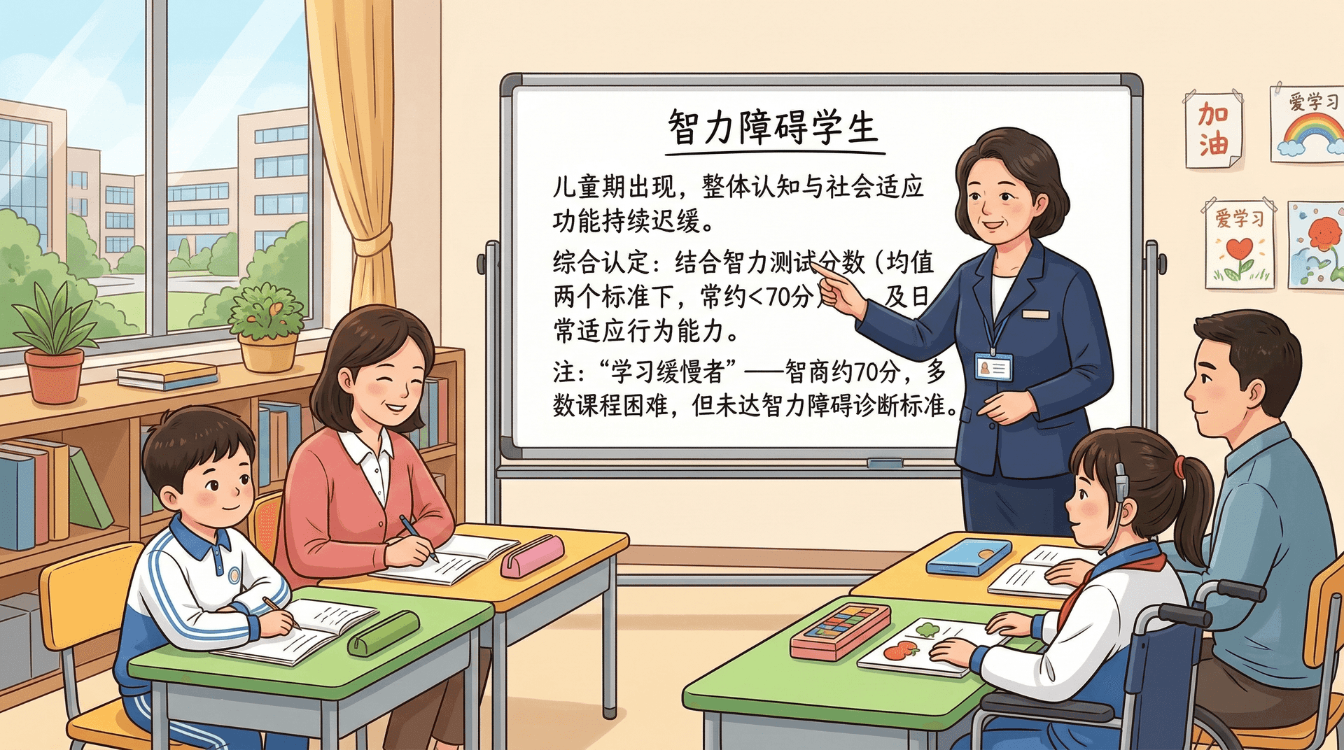 智力障碍是一种在儿童期出现的、表现为整体认知和社会适应功能持续迟缓的状态。通常将智力测试分数超过正常均值两个标准差以下的学生,结合其日常适应性行为能力来进行综合认定。那些智商分数在70分左右、在多数课程上存在明显困难但尚未达到智力障碍诊断标准的学生,有时被非正式地称为“学习缓慢者”。