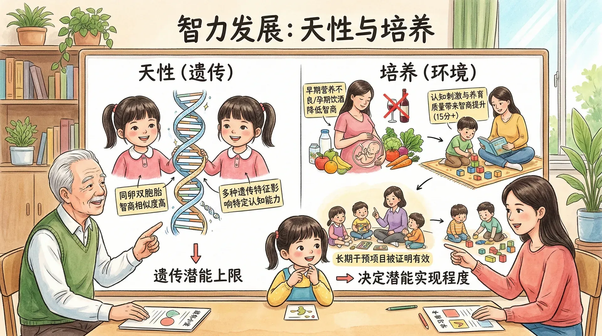 智力究竟是“天生的”还是“后天培养的”,这一问题在心理学界争论了一百多年,至今仍没有简单的答案。研究表明,遗传因素确实在智力发展中扮演着一定角色——同卵双胞胎即使在不同家庭中长大,其智商分数的相似程度仍然高于异卵双胞胎。但这并不意味着存在一个决定智力高低的单一“智力基因”,而是说儿童可能继承了影响特定认知能力的多种遗传特征。