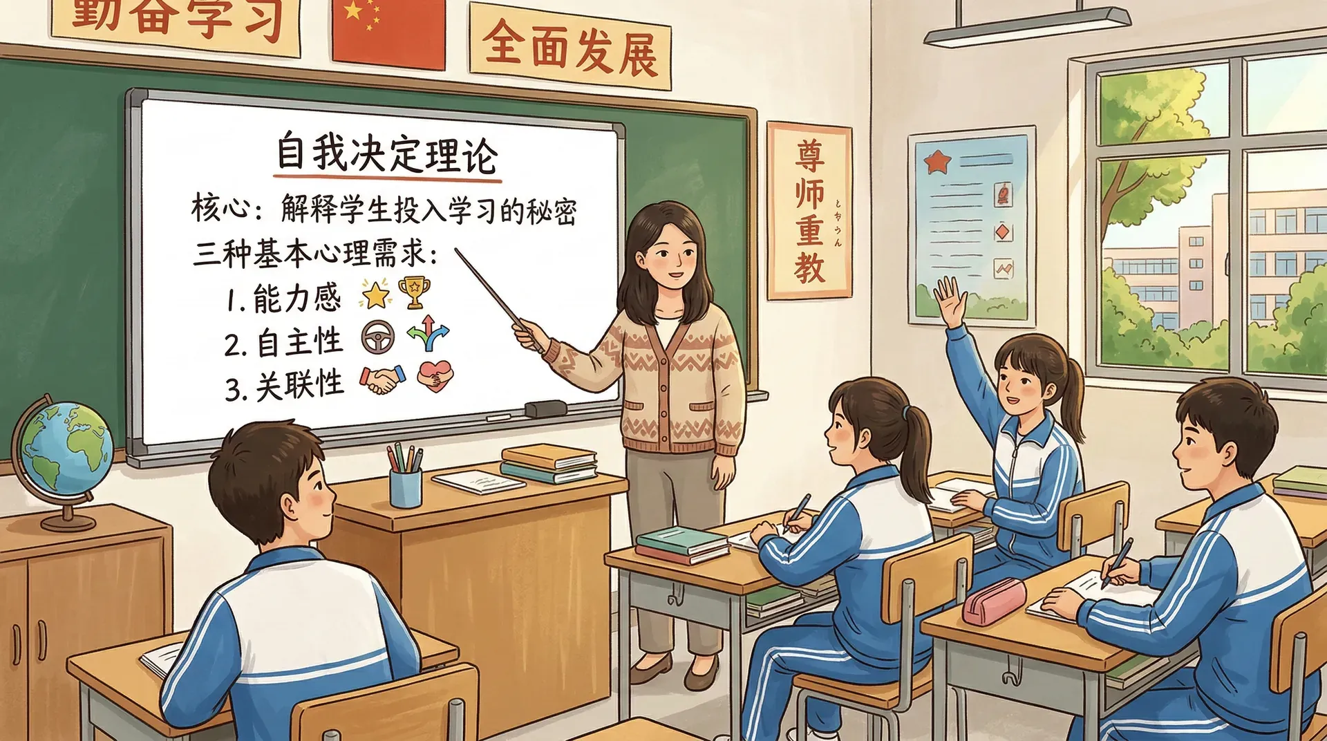 自我决定理论是目前解释学习动机最有影响力的理论框架之一。它关注的核心问题是:学生为什么会真正投入一件事?这个理论认为,人类有三种基本的心理需求——能力感、自主性和关联性,这三种需求的满足程度,直接决定了学生的动机质量。