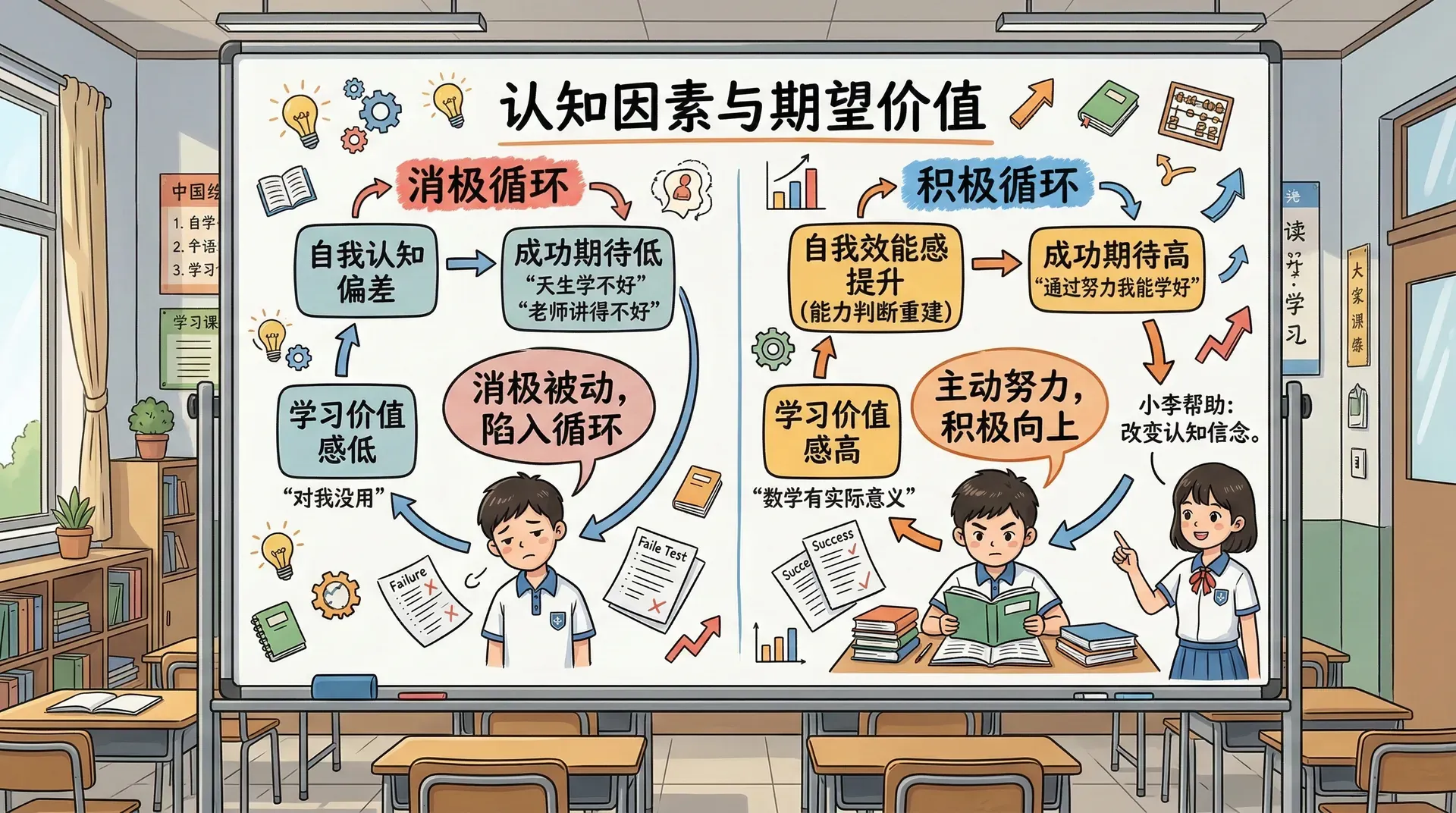 小明从数学不及格到主动学习的过程,背后涉及的不只是“努力与否”的问题,更是一系列认知层面的转变。他一开始的信念——自己天生学不好数学、老师讲得不好——让他对成功毫无期待,也感受不到数学学习对自己有什么价值。这两个因素叠加在一起,使他陷入了持续的消极循环。当小李帮助他重建了对自身能力的判断,并让他看到掌握数学对升学的实际意义时,小明才从被动变为主动。