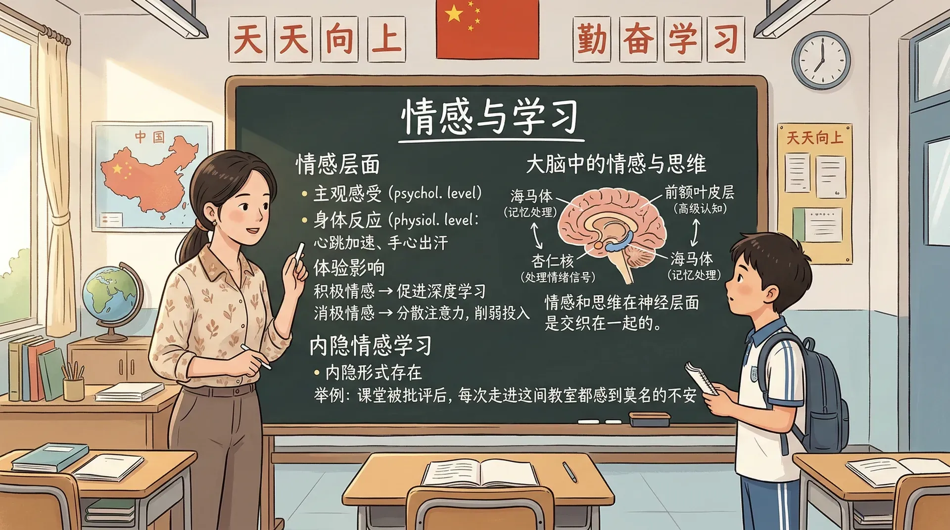 情感是动机的重要组成部分,也是影响学习质量的关键变量。它包含两个层面:心理层面的主观感受,以及生理层面的身体反应(心跳加速、手心出汗等)。积极的情感体验能促进深度学习,消极的情感体验则会分散注意力,削弱学生的认知投入。