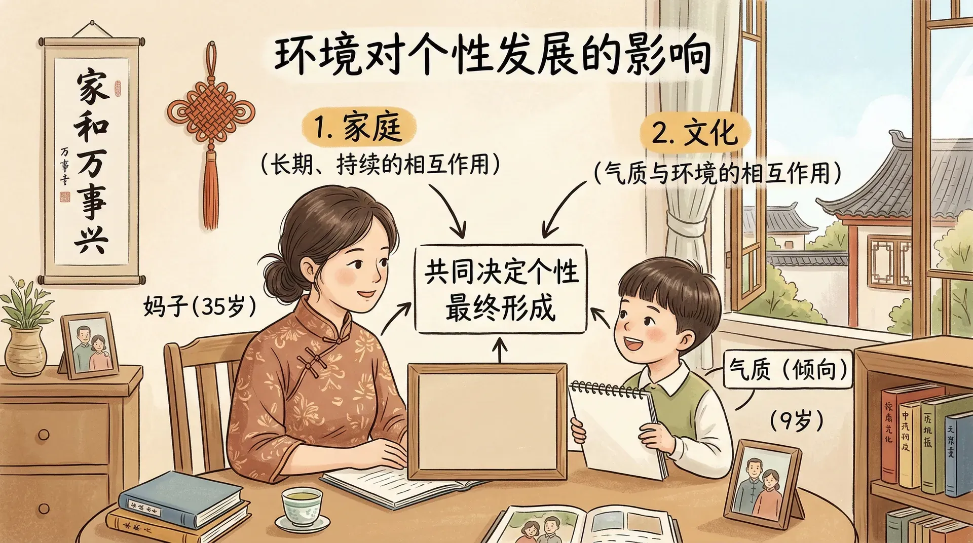 气质提供了个性发展的生物学基础,但它只是一种倾向,而非命运。真正决定一个孩子最终形成怎样个性的,是气质与环境之间长期、持续的相互作用。影响个性发展最深远的两类环境因素,一是家庭,二是文化。