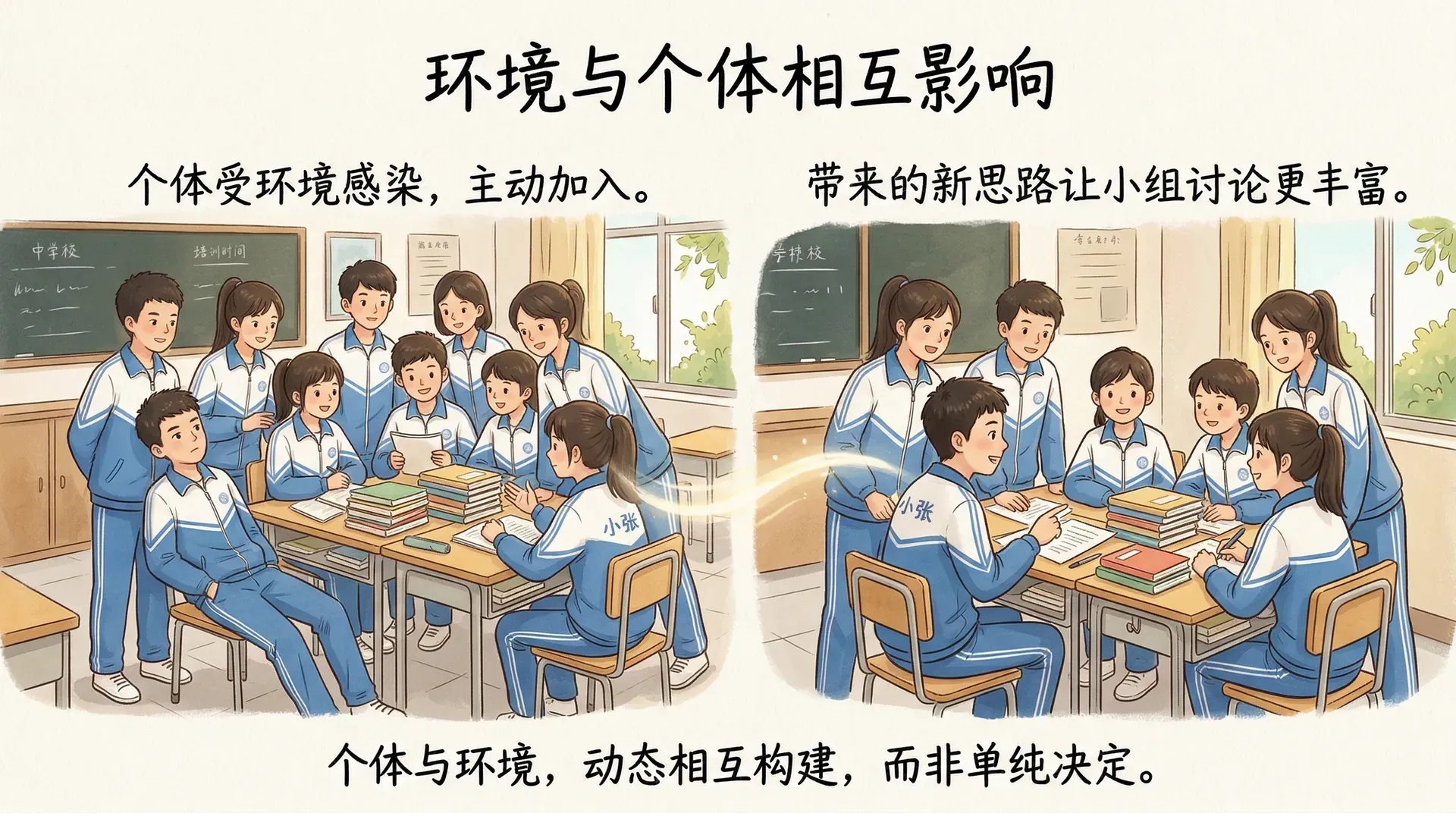 这个过程中,环境影响了小张,而小张的加入也改变了环境。个体与环境之间形成了一种动态的相互构建关系,而不是某一方单纯地决定另一方。